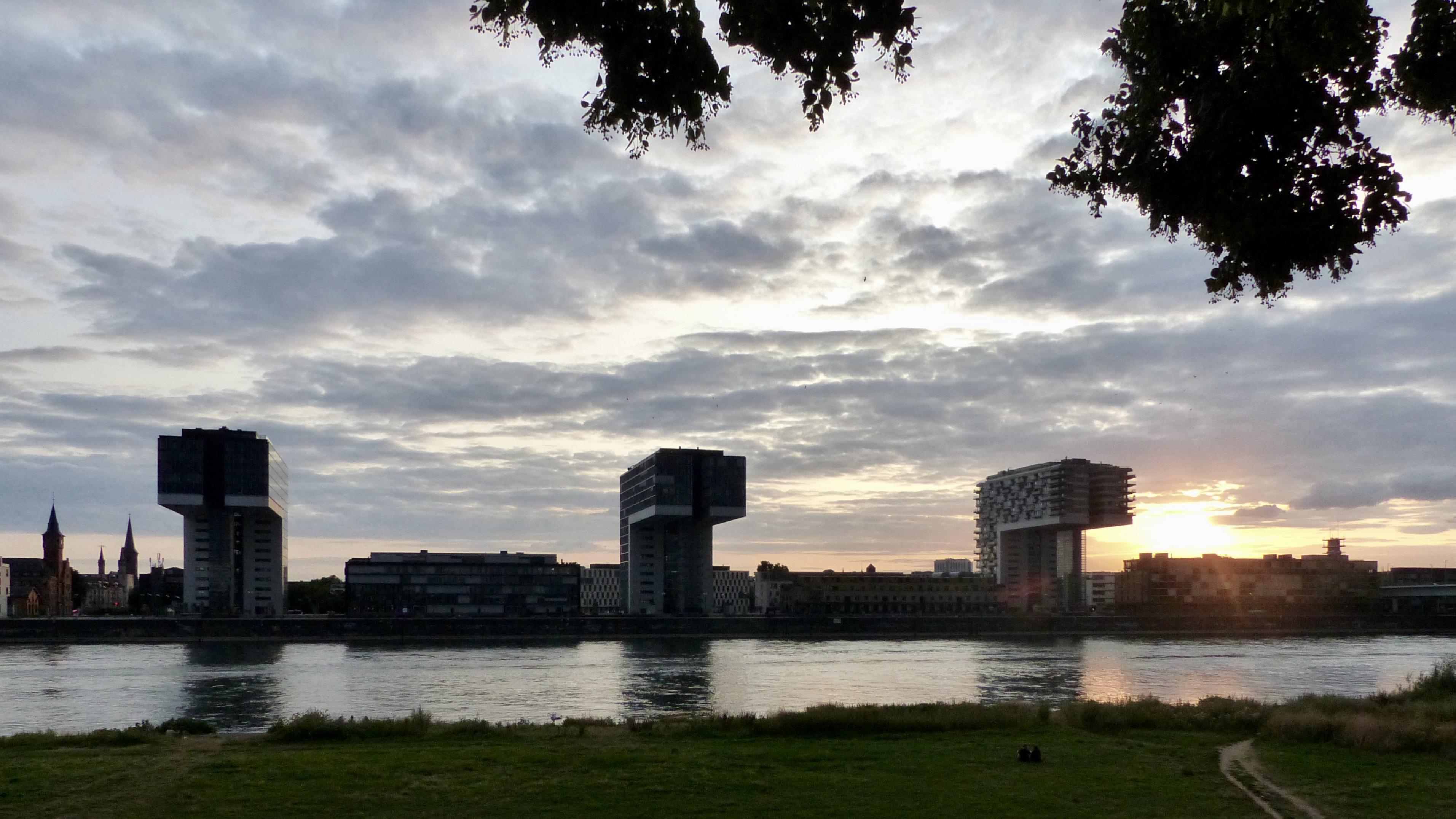 Blick über den Rhein in Köln auf die Kranhäuser am Rheinauhafen in die untergehende Sonne