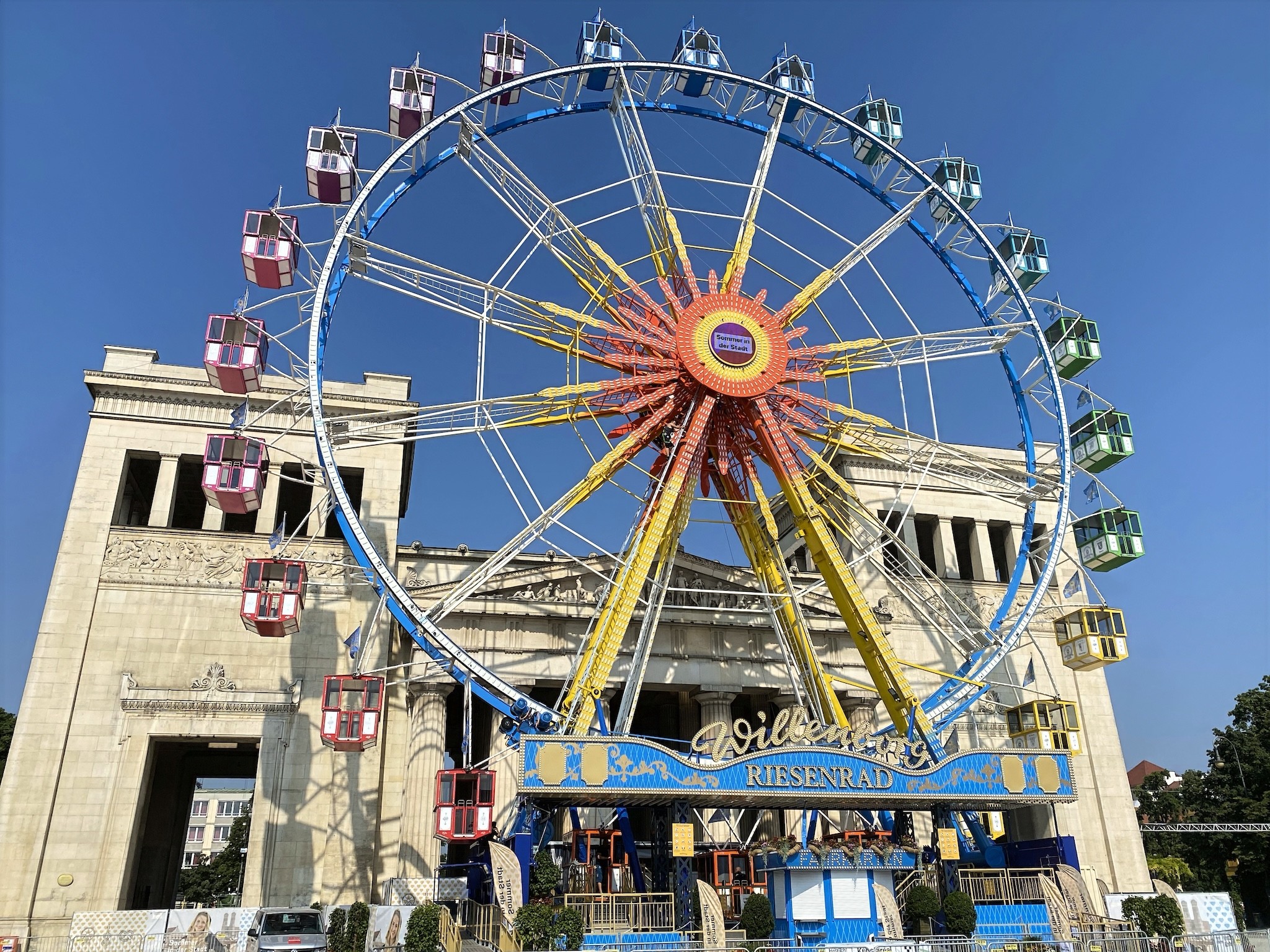 Das rechteckige Farbfoto zeigt ein großes Riesenrad vor den Propyläen. Die Gondeln des Riesenrads sind in verschiedenen Farben gehalten: rot, blau, grün und gelb. Im unteren Bereich des Bildes sieht man die Eingangsplattform des Riesenrads mit dem Schriftzug „Willkommen“ und darunter „Riesenrad“ in verspielter Schrift auf einem blauen Banner. Der Himmel ist klar und blau.