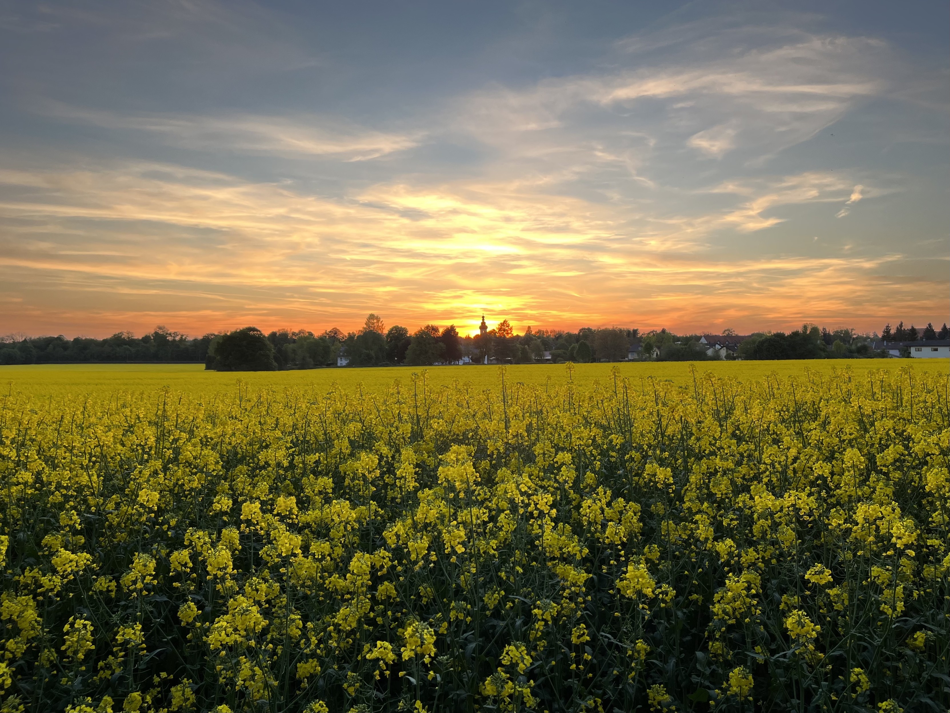 Ein großes Rapsfeld unter einem Sonnenuntergangshimmel, mit weichen Wolken und einem warmen Schein am Horizont. In der Ferne sind kleine Wäldchen und eine Dorfkulisse sichtbar.