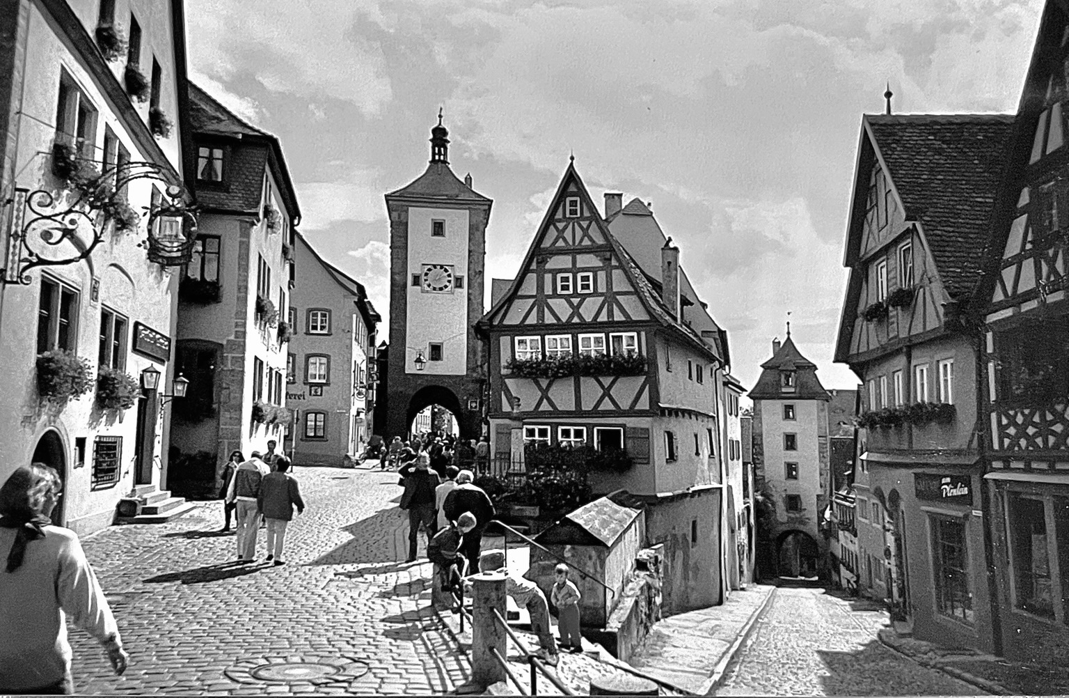 Hintergrundbild einer Szene auf Melee Island aus Secret of Monkey Island. in der linken Bildhälfte führt eine Straße vom Betrachter weg bergauf unter einem Torturm mit großer Uhr hindurch, in der rechten Bildhälfte führt sie bergab durch einen Torbogen in Richtung Hafen. Die Perspektive und Anordnung der Häuser ist sehr ähnlich zum Foto von Rothenburg ob der Tauber im vorherigen Post.