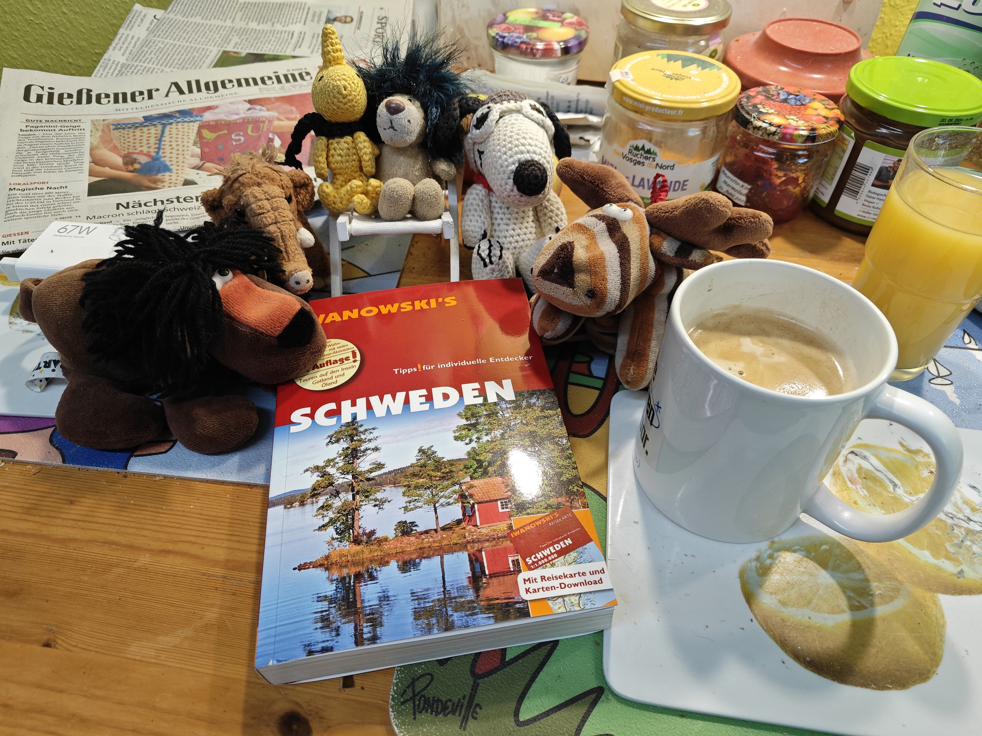 Verschiedene Plüschtiere haben sich um einen Reiseführer für Schweden versammelt, der auf dem Frühstückstisch liegt.