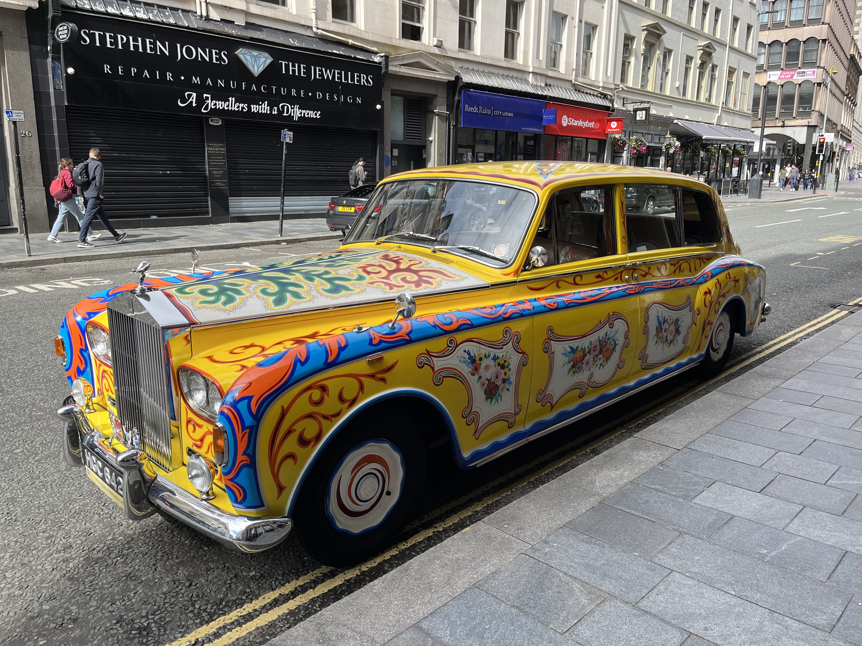 Ein hell bemalter Rolls-Royce mit komplizierten floralen und abstrakten Designs in Gelb, Blau und Rot steht auf einer Stadtstraße. Der Hintergrund zeigt ein Juweliergeschäft und Fußgänger, die vorbeigehen. Das Model in der Bemalung dem, das John Lennon besessen hat und soll wohl an ihn erinnern.