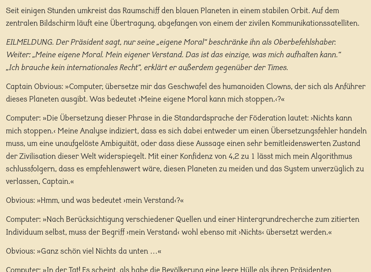 Ausschnitt des Texts (für den gesamten Text dem Link im Post folgen): Seit einigen Stunden umkreist das Raumschiff den blauen Planeten in einem stabilen Orbit. Auf dem zentralen Bildschirm läuft eine Übertragung, abgefangen von einem der zivilen Kommunikationssatelliten. EILMELDUNG. Der Präsident sagt, nur seine „eigene Moral“ beschränke ihn als Oberbefehlshaber. Weiter: „Meine eigene Moral. Mein eigener Verstand. Das ist das einzige, was mich aufhalten kann.“ „Ich brauche kein internationales Recht”, erklärt er außerdem gegenüber der Times. Captain Obvious: »Computer, übersetze mir das Geschwafel des humanoiden Clowns, der sich als Anführer dieses Planeten ausgibt. Was bedeutet ›Meine eigene Moral kann mich stoppen.‹?« Computer: »Die Übersetzung dieser Phrase in die Standardsprache der Föderation lautet: ›Nichts kann mich stoppen.‹ Meine Analyse indiziert, dass es sich dabei entweder um einen Übersetzungsfehler handeln muss, um eine unaufgelöste Ambiguität, oder dass diese Aussage einen sehr bemitleidenswerten Zustand der Zivilisation dieser Welt widerspiegelt. Mit einer Konfidenz von 4,2 zu 1 lässt mich mein Algorithmus schlussfolgern, dass es empfehlenswert wäre, diesen Planeten zu meiden und das System unverzüglich zu verlassen, Captain.« Obvious: »Hmm, und was bedeutet ›mein Verstand‹?« Computer: »Nach Berücksichtigung verschiedener Quellen und einer Hintergrundrecherche zum zitierten Individuum selbst, muss der Begriff ›mein Verstand‹ wohl ebenso mit ›Nichts‹ …