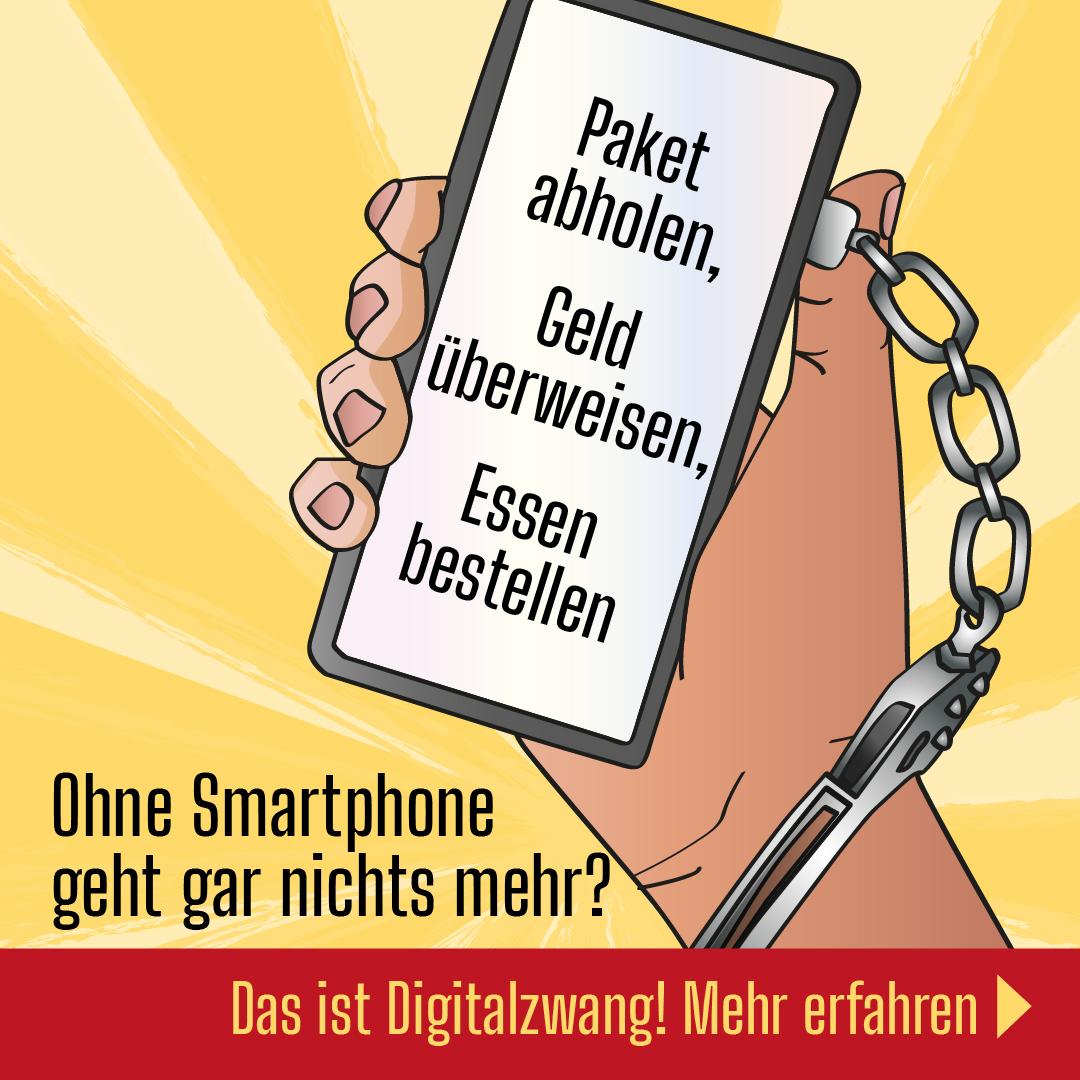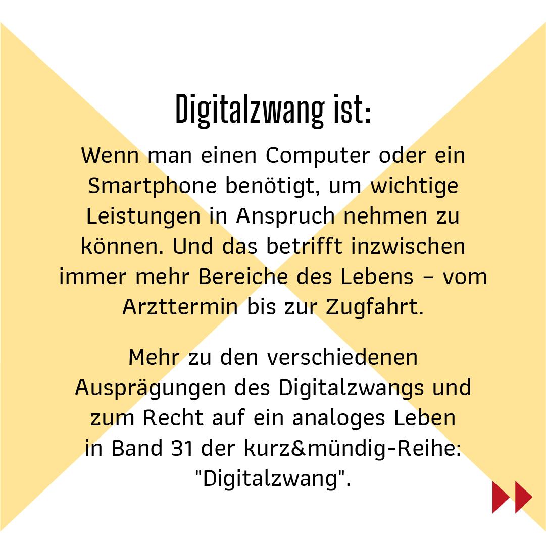 Wenn man einen Computer oder ein Smartphone benötigt, um wichtige Leistungen in Anspruch nehmen zu können. Und das betrifft inzwischen immer mehr Bereiche des Lebens – vom Arzttermin bis zur Zugfahrt. Mehr zu den verschiedenen Ausprägungen des Digitalzwangs und zum Recht auf ein analoges Leben in Band 31 der kurz&mündig-Reihe: "Digitalzwang".