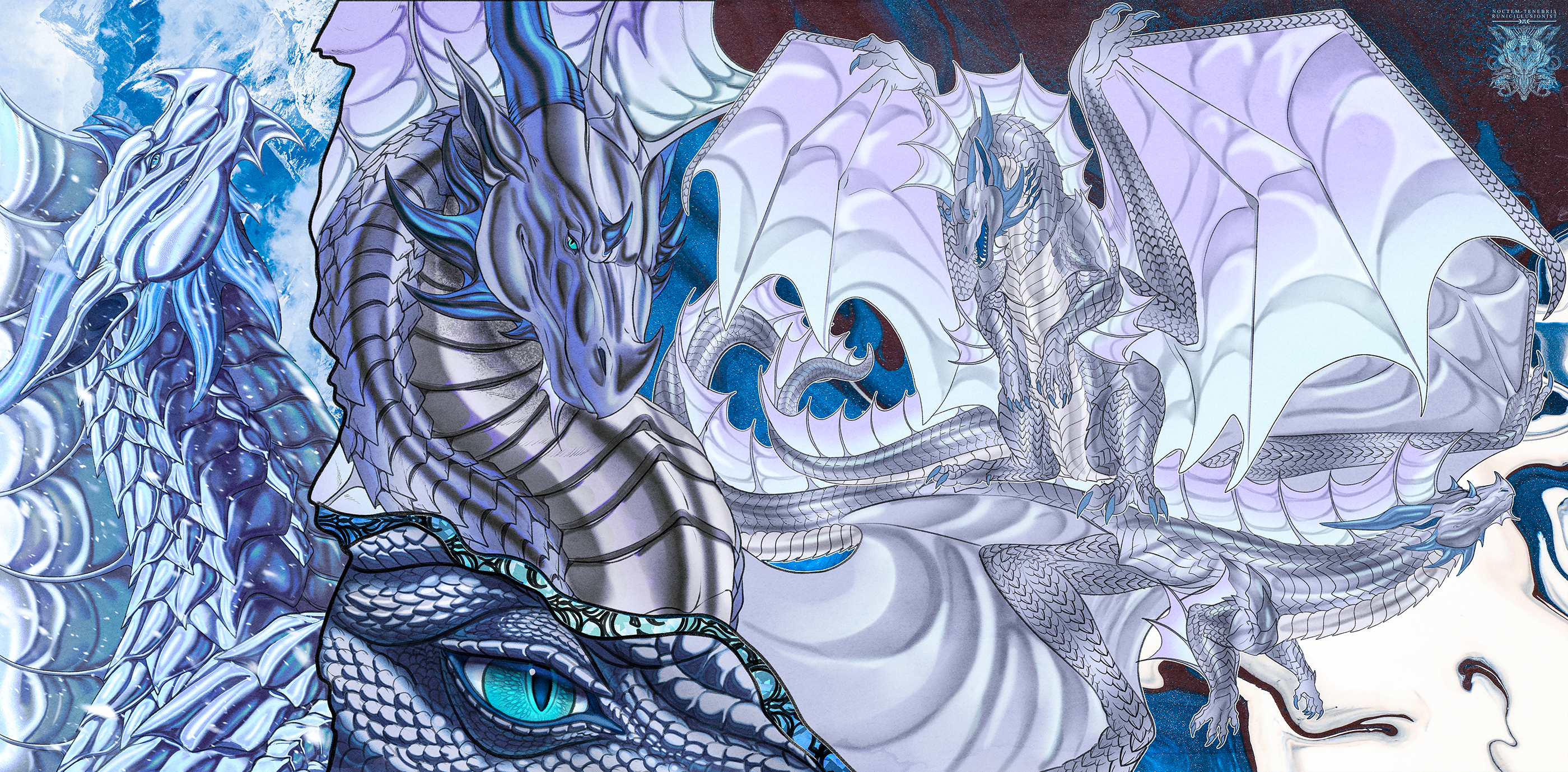 Drawing, character sheet. Theo, luceiry dragon. 170cm. Male. Iridescent sales. Black with sheen most prominent in cyan colour. Ears & wings are leathery. Mane feels rough. Theo is an outcast of his species but enjoys time alone & far from civilization. He is observant, kind (towards anything) & smart. But avoidant of conflict and prefers to flee. Theo enjoys documenting natural phenomenas & circles of life. Tiptoes to move silently. Clothed view with hoodie & pants: Tongue gesture upwards means: Nervous, Anxious, focus on self etc. Clothed view with cape: Tongue gesture downwards means: Hello, confidence, paying attention. Clothes for travel and everyday use. Items carried: Sketches & notes book, drawing supplies, bag for shiny stones, a key. Two headshots: Young Theo age 20-30. Older Theo age 30~40, larger horns, longer mane. Theo suffers from slow physical growth, most visible in horns, and is small (for a dragon). Art & Theo (c) Neotheta