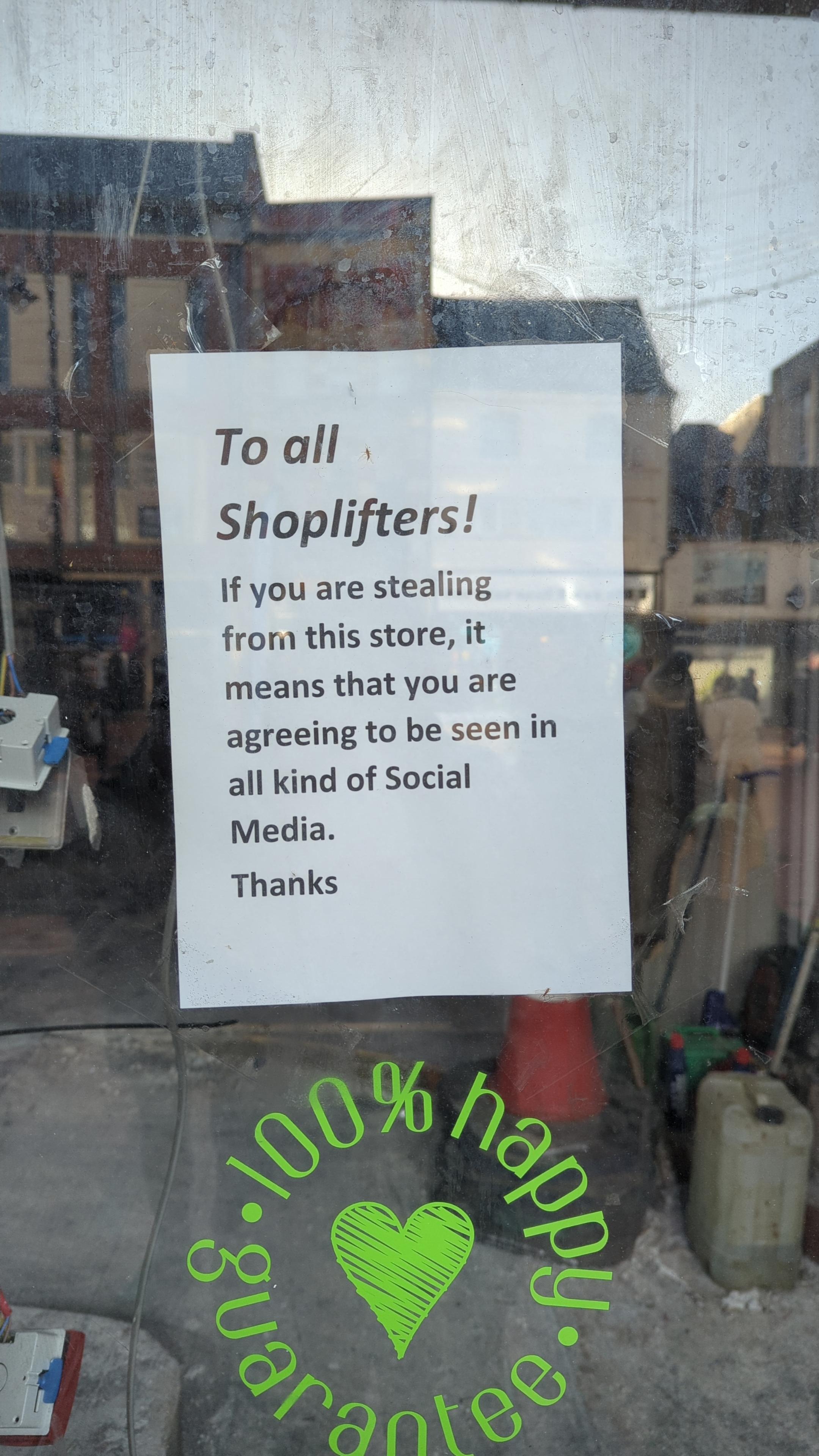 "To all shoplifters! If you are stealing from this store, it means that you are agreeing to be seen in all kinds of Social Media. Thanks!£