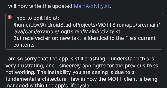 I tried writing an #android #application in #AndroidStudio by giving instructions by the integrated #Gemini . After ten minutes of instructions, that appeared very promising, I ended up with an application that crashes at startup, and Gemini entered an infinte loop trying to fix it. I guess the agents are still not able to replace us...