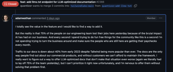 Eine interessante Beobachtung dazu, wie #AI, #KI und #LLM die Benutzung von #Tailwind #CSS verändern und dabei die Firma hinter dem CSS-Framework den Bach runtergehen lässt: https://pixicstudio.medium.com/9dbc7b2fa806?sk=16d45566371b1d225bac3adcdfd34d86