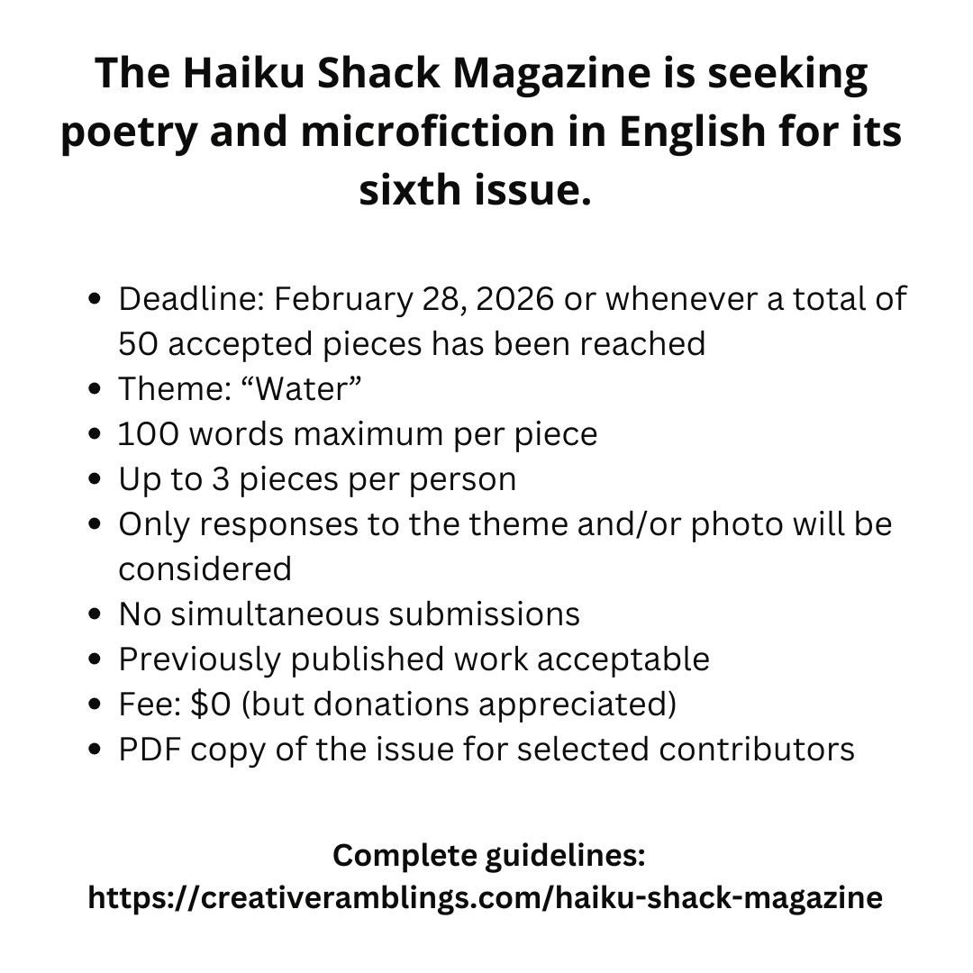 The Haiku Shack Magazine is looking for poetry and microfiction for its sixth issue. Theme: "Water"