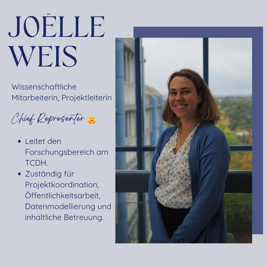 Porträt einer Frau namens Joelle Weis, stehend vor einem Fenster mit Bäumen im Hintergrund. Links daneben Text über ihre Tätigkeit als Leiterin des Forschungsbereich am TCDH. Zuständig für Projektkoordination, Öffentlichkeitsarbeit, Datenmodellierung und inhaltliche Betreuung.
