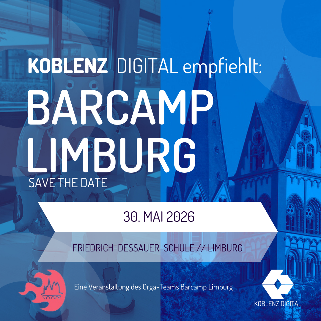 Veranstaltungsgrafik mit dem Titel „Barcamp Limburg – Save the Date“. Links im Bild ein stilisierter Roboter, rechts eine Kathedrale – Symbol für den Kontrast und die Verbindung von Technologie und Tradition. Der Termin ist der 30. Mai 2026, Veranstaltungsort ist die Friedrich-Dessauer-Schule in Limburg. Empfohlen von „KOBLENZ DIGITAL“, organisiert vom Orga-Team Barcamp Limburg. Die Bildstimmung ist zukunftsgewandt, offen und community-orientiert.