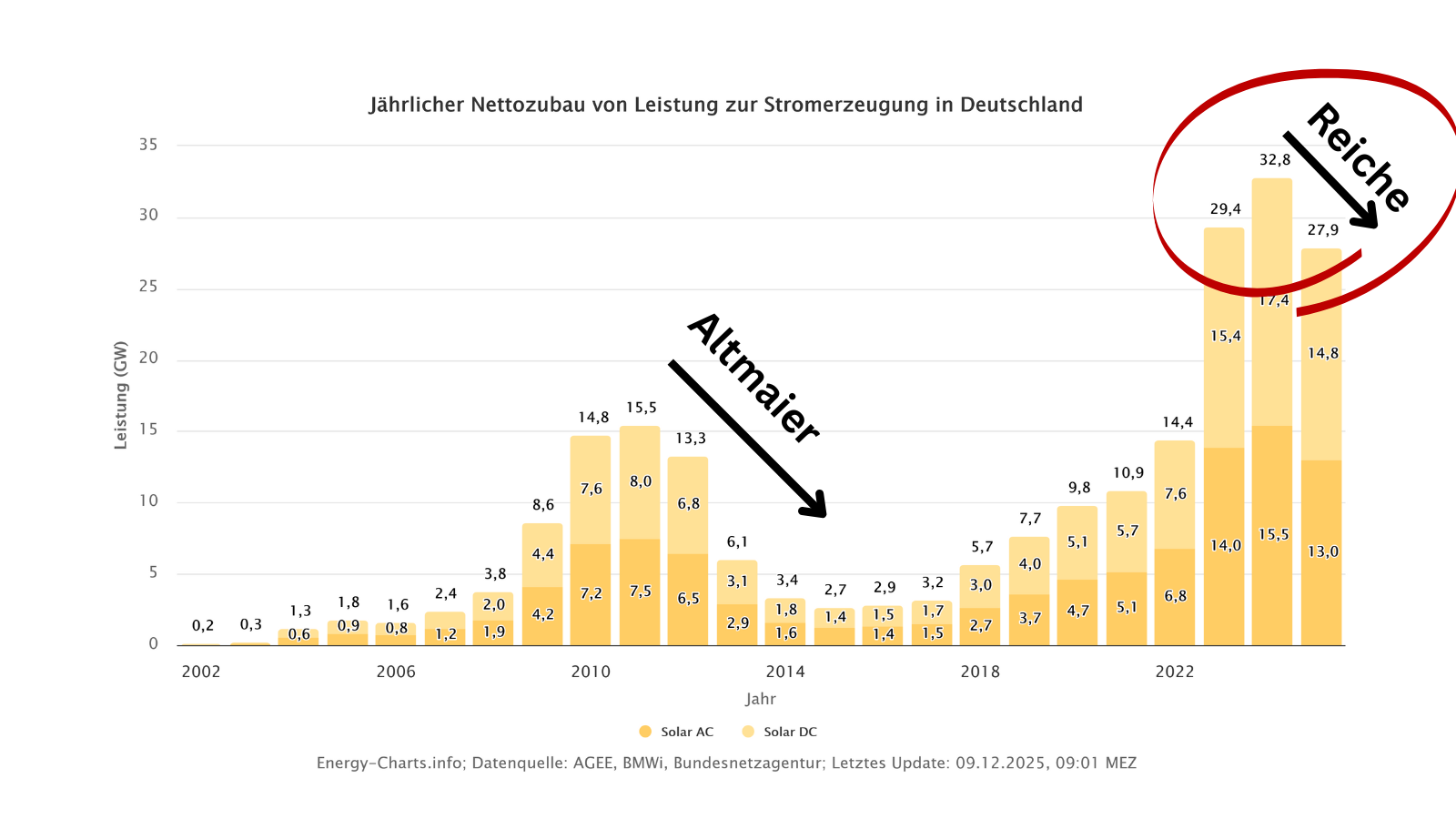 "Schon 2012 hatte Katherina Reiche (CDU) als verantwortliche Staatssekretärin unter Minister Peter Altmaier (CDU) eine EEG-Reform zu verantworten, die hohe volkswirtschaftliche Schäden verursachte. Der jährliche Ausbau der Photovoltaik wurde dadurch drastisch von etwa sieben Gigawatt auf unter zwei Gigawatt gedrosselt.[]Ministerin #Reiche bereitet offensichtlich einen noch größeren Schaden vor. Seit ihrem Amtsantritt im letzten Jahr als Bundeswirtschaftsministerin kündigt sie immer neue Maßnahmen an, die den Ausbau der erneuerbaren Energien erneut massiv unter Druck setzen. So hat sich das Wachstum der Photovoltaik-Installationen, das unter ihrem Vorgänger Habeck stark zunahm, schon deutlich verlangsamt. Erste Photovoltaik-Unternehmen sind in Konkurs, viele Solarinstallateure haben kaum mehr neue Aufträge und müssen Arbeitsplätze abbauen."