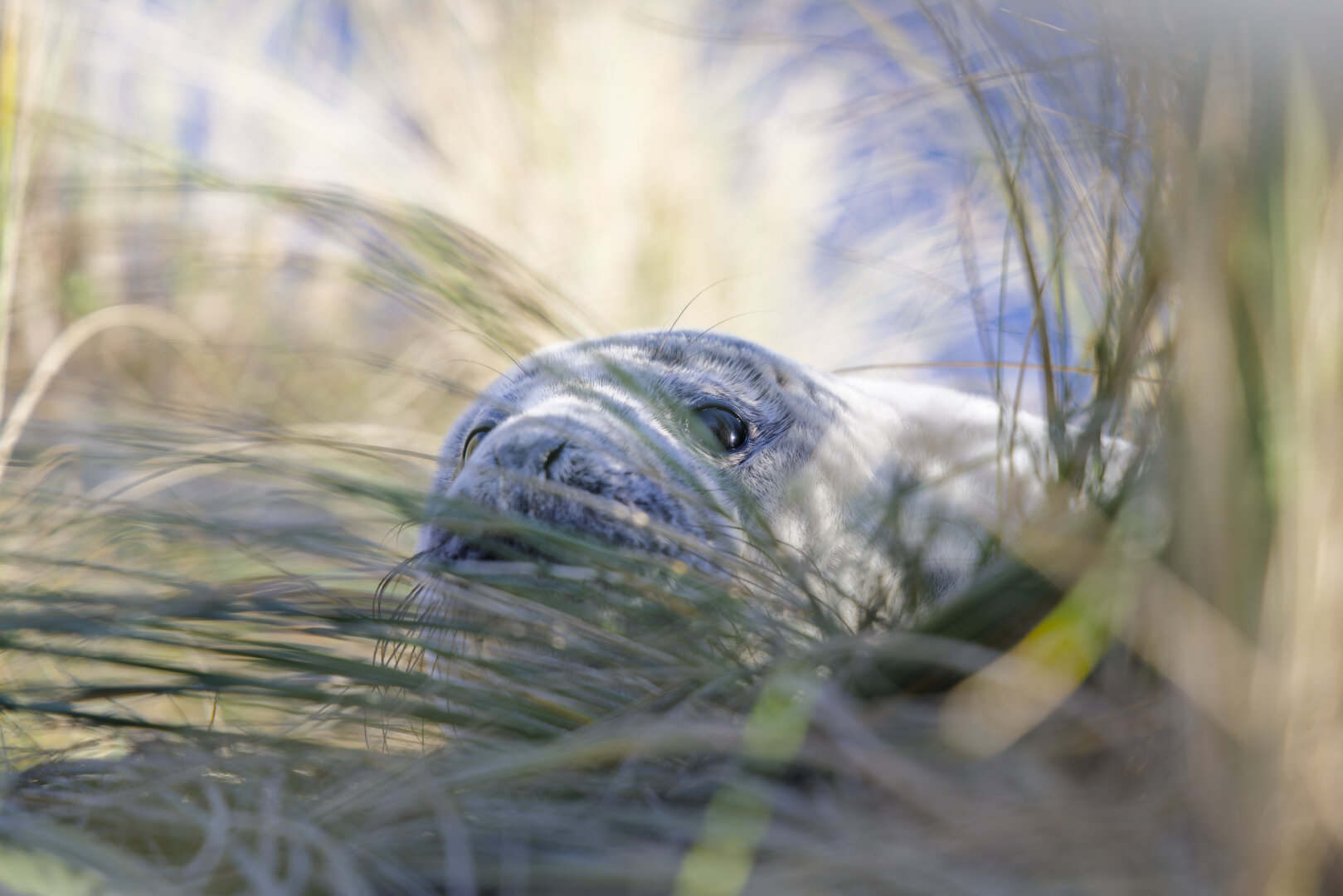 Eine kleine Kegelrobbe versteckt sich im Dünengras.