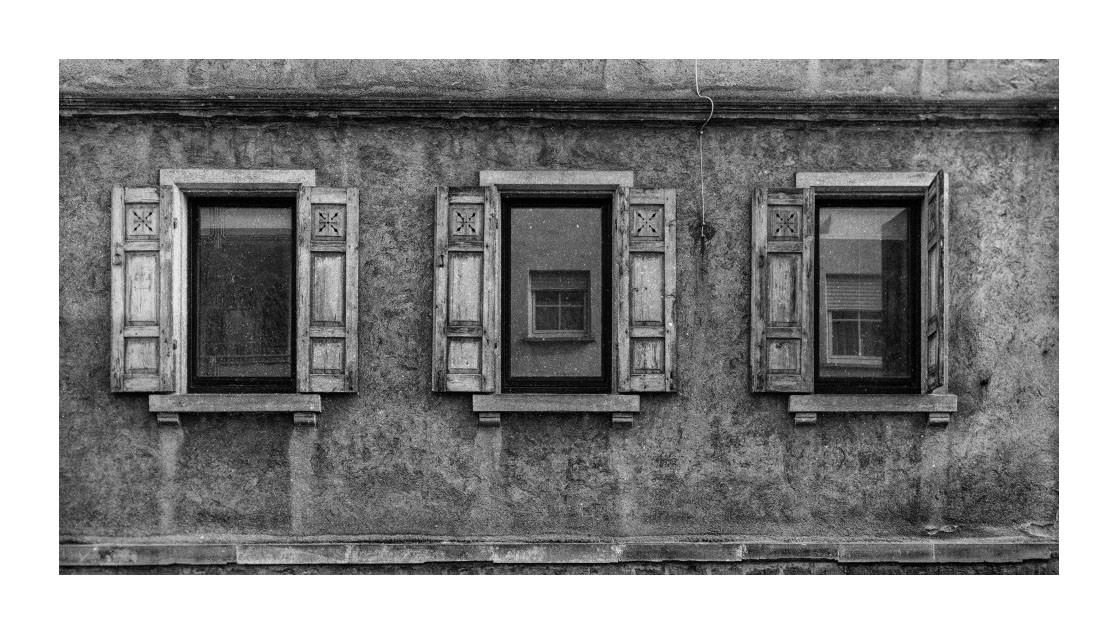drei nebeneinanderliegende Fenster mit hölzernen Fensterläden, in denen sich die Fenster des gegenüber stehendes Gebäude spiegeln