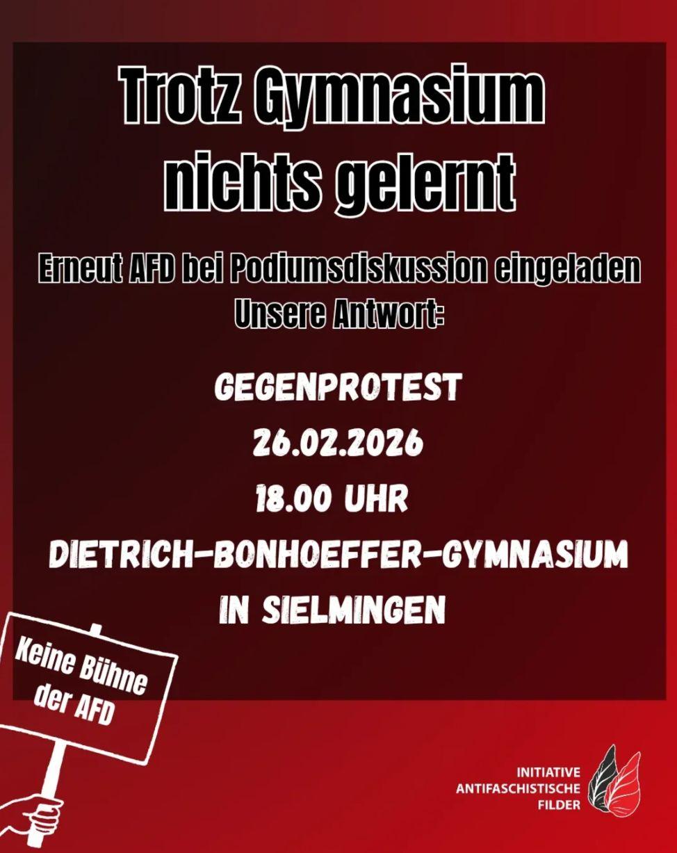 Am 26.02.2026 findet in #Filderstadt- #Sielmingen eine Podiumsdiskussion im Dietrich-Bonhoeffer(!)-Gymnasium mit dem #AfD Kandidaten Felix Schneider statt. Besonders brisant ist das Ganze, da nach unserem letztmaligen Protest die SMV der Schule bereits eine #Podiumsdiskussion außerhalb der Schule geplant hat um die AfD nicht einladen zu müssen. Der Rektor und das Lehrer:innen-Kollegium bestehen aber auf einer Veranstaltung in der Schule und so "muss aus Neutralitätsgründen" die AfD mit aufs Podium. Wir finden das eine ziemliche Schweinerei, trotz klugem Verhalten der SMV eine auswärtige Podiumsdiskussion zu veranstalten, die Schüler:innen zu zwingen #Rechtsradikale und #Rassisten in die #Schule zu lassen!