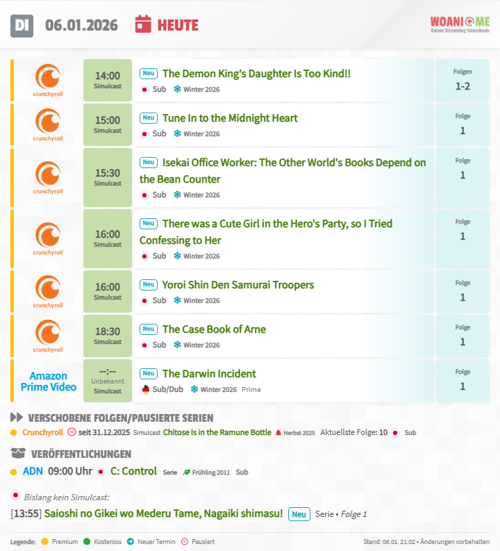 Das #Anime #Streaming Programm für Dienstag, den 06.01.