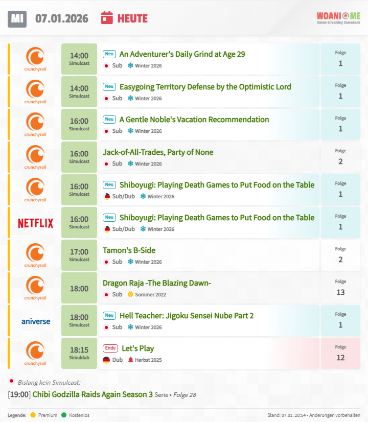 Das #Anime #Streaming Programm für Mittwoch, den 07.01.