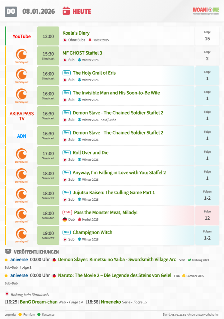 Das #Anime #Streaming Programm für Donnerstag, den 08.01.