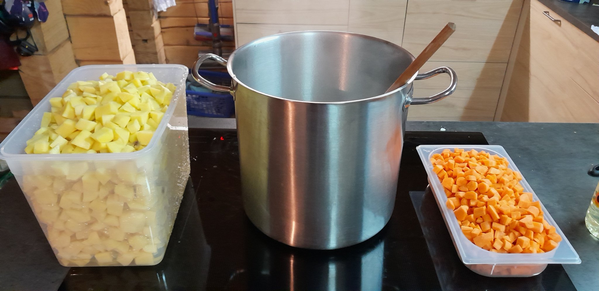 Foto: Mein größtes Kochprojekt bisher, die Befütterung von 40+ Ultraläufer:innen mit veganer Kartoffelsuppe auf der halben und Langstrecke (43/73km) beim Three Kings Trails in Reichenbach in der Oberpfalz.
