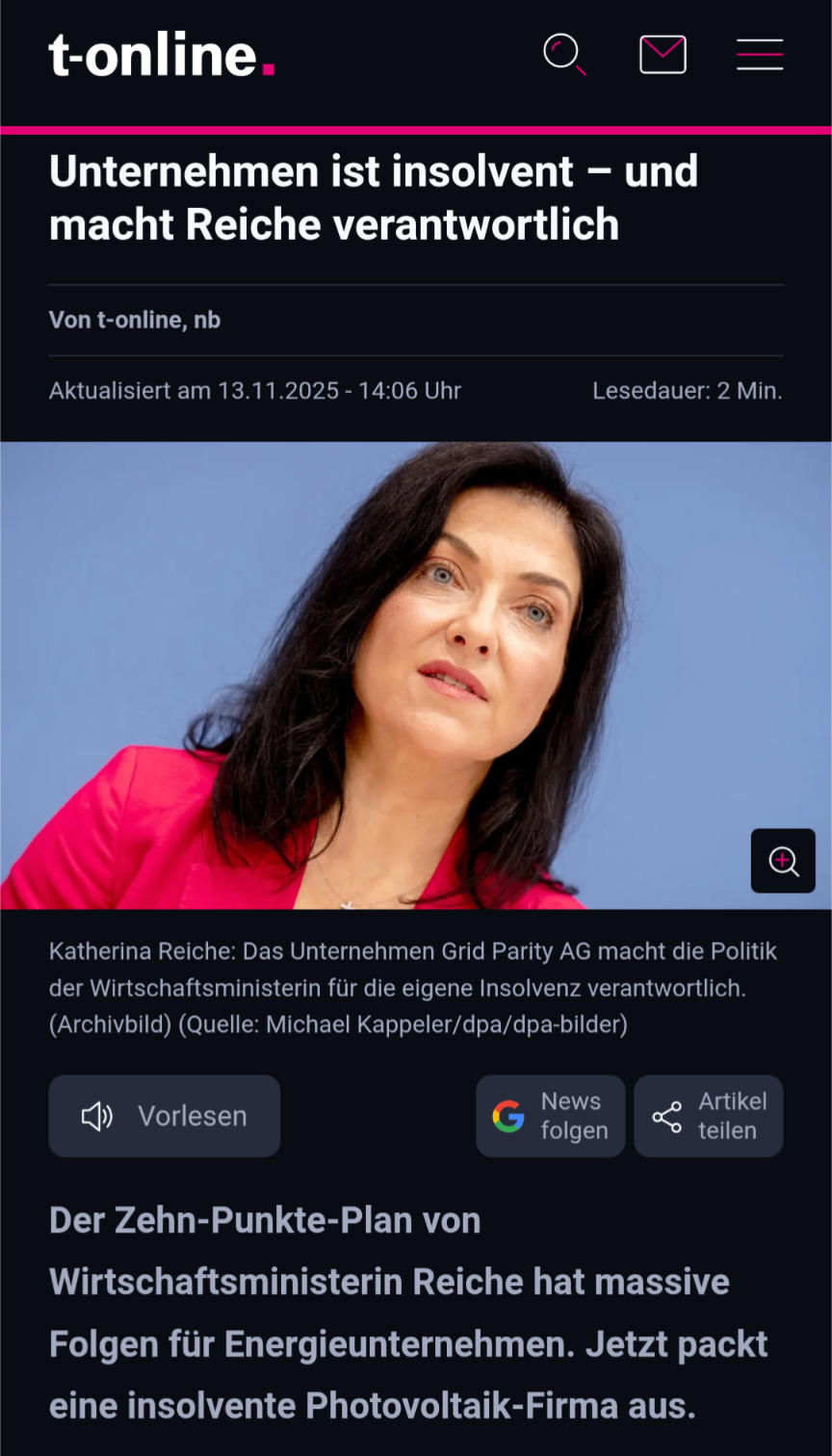 Eine Photovoltaik Firma mach Wirtschaftsministerin #lobbyreiche #cdu für ihre Insolvenz verantwortlich.