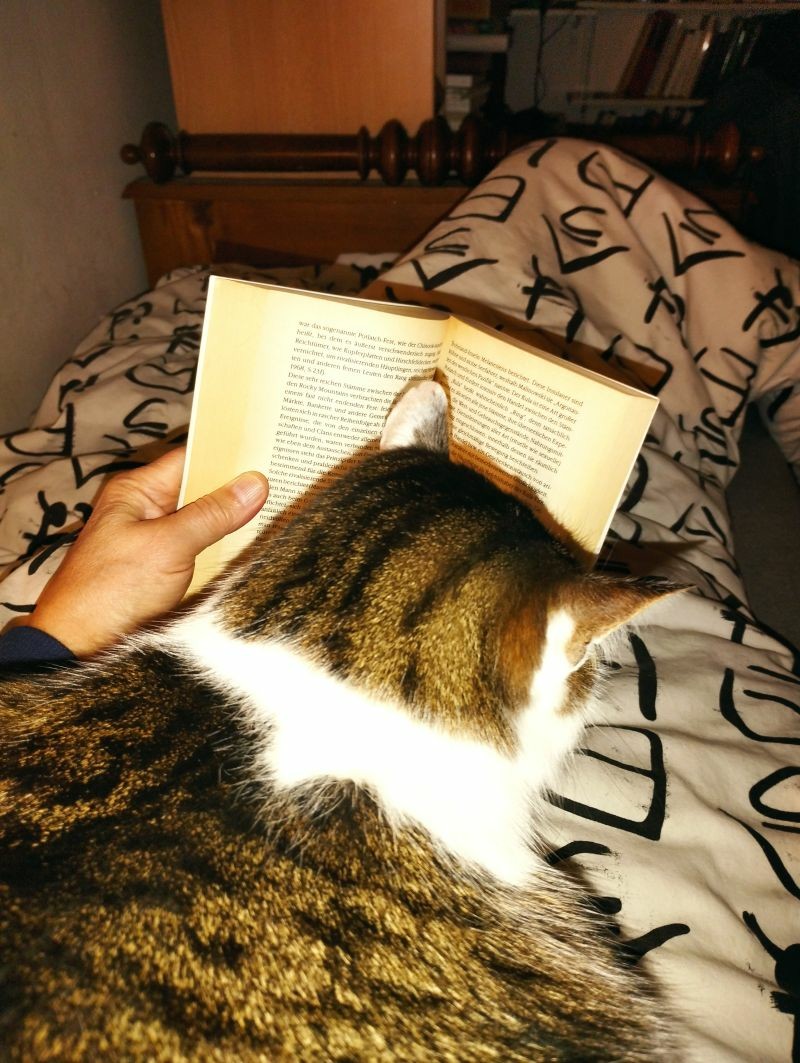 Katze und Lesen - wenn das immer so einfach wär'. Mal vor dem Buch, mal dahinter, mal Mitlesen, mal Ignorieren. Und sich dann beschweren, wenn das mit dem Streicheln und Kraulen nicht klappt.