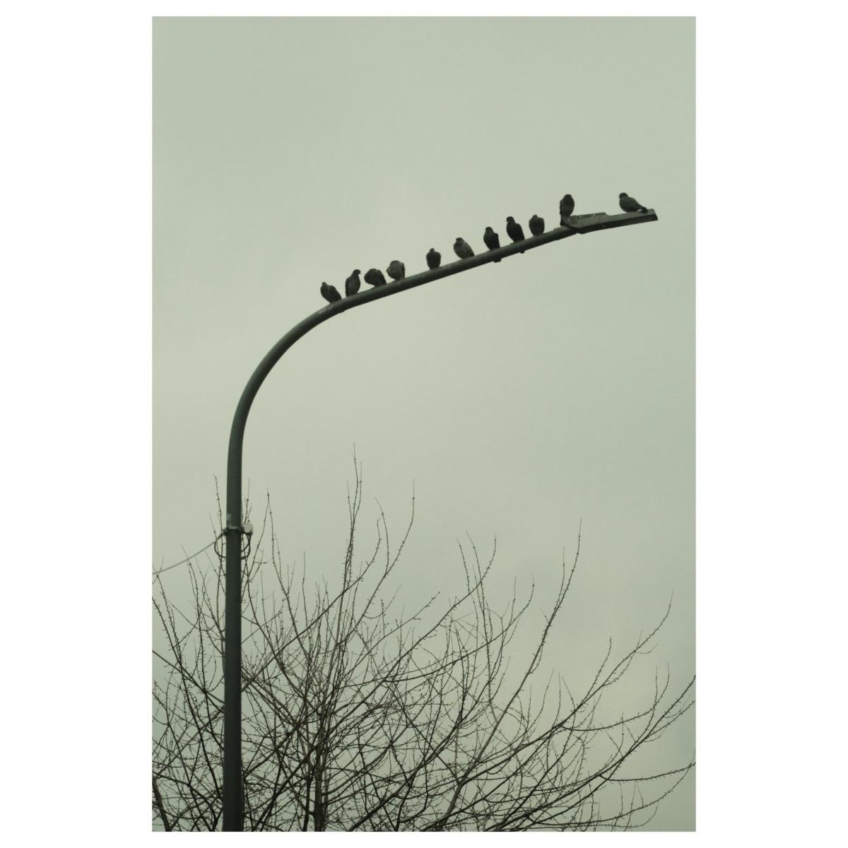 Auf einer lang gebogenen Straßenlaterne sitzen 11 Tauben nebeneinander aufgereiht. Unterhalb der Laterne reckt ein Baum seine Blattlosen Äste dürr in den Himmel.
