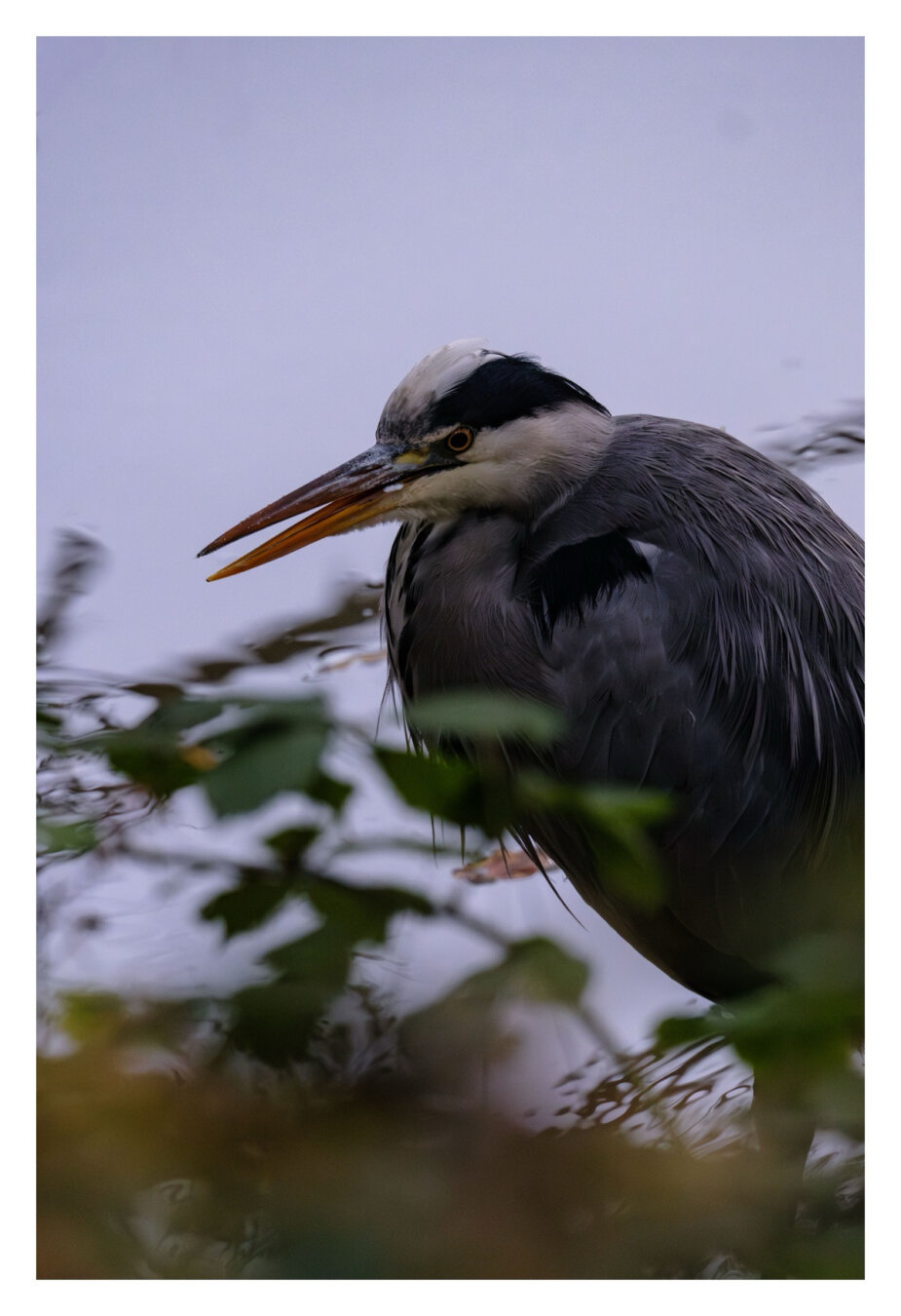 Foto im Hochformat. Teleaufnahme. Ein Graureiher sitzt am Rande eines Flusses. Graues Gefieder, am Kopf weiß und schwarz, dunkelrot-orangener langer Schnabel. Im Vordergrund ist unscharf Gestrüpp.