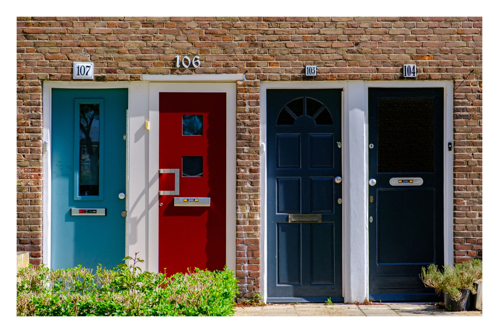 Foto im Querformat. Eine braune Backsteinmauer. Vier gleichgeordnete Türen nebeneinander. Hellblau, rot und zwei mal dunkelblau. Von rechts nach links sind darüber die Hausnummern 104 bis 107. in den Türen sind verschiedene Muster und kleine Fenster. Vor den linken beiden Türen ist hellgrünes niedriges Gebüsch.