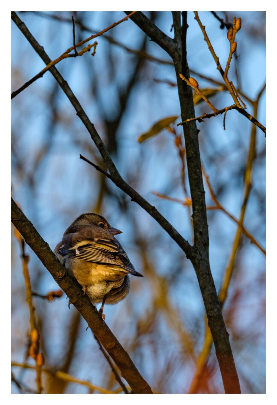 Foto im Hochformat. Teleaufnahme. Ein Buchfink, ein kleiner Vogel, sitzt auf einem dünnen Ast, umgeben von anderen dünnen Ästen. Der Vogel hat der Kamera den Rücken zugewandt. Er schaut über die rechte Schulter nach hinten. Es ist kurz vor Sonnenuntergang, dementsprechend ist der Vogel in goldene Licht getaucht.