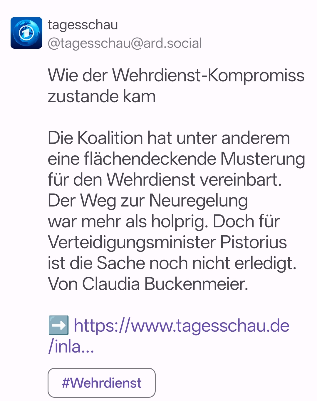 Echt jetzt? Nur für Männer? Im Jahr 2025? Schon mal von #Geschlechtergerechtigkeit, #Gleichberechtigung und #Gleichbehandlung gehört? Wie wollen wir denn bitte dieser Generation heranwachsender Männer glaubhaft machen, dass das gute Ideen sind, wenn wir sie derart verarschen? Sind das krasseste Rückschritte oder waren wir eigentlich nie so weit? #Wehrdienst #Wehrpflicht #Musterung #Feminismus #Absurdistan #Mittelalter https://ard.social/@tagesschau/115543615971069762