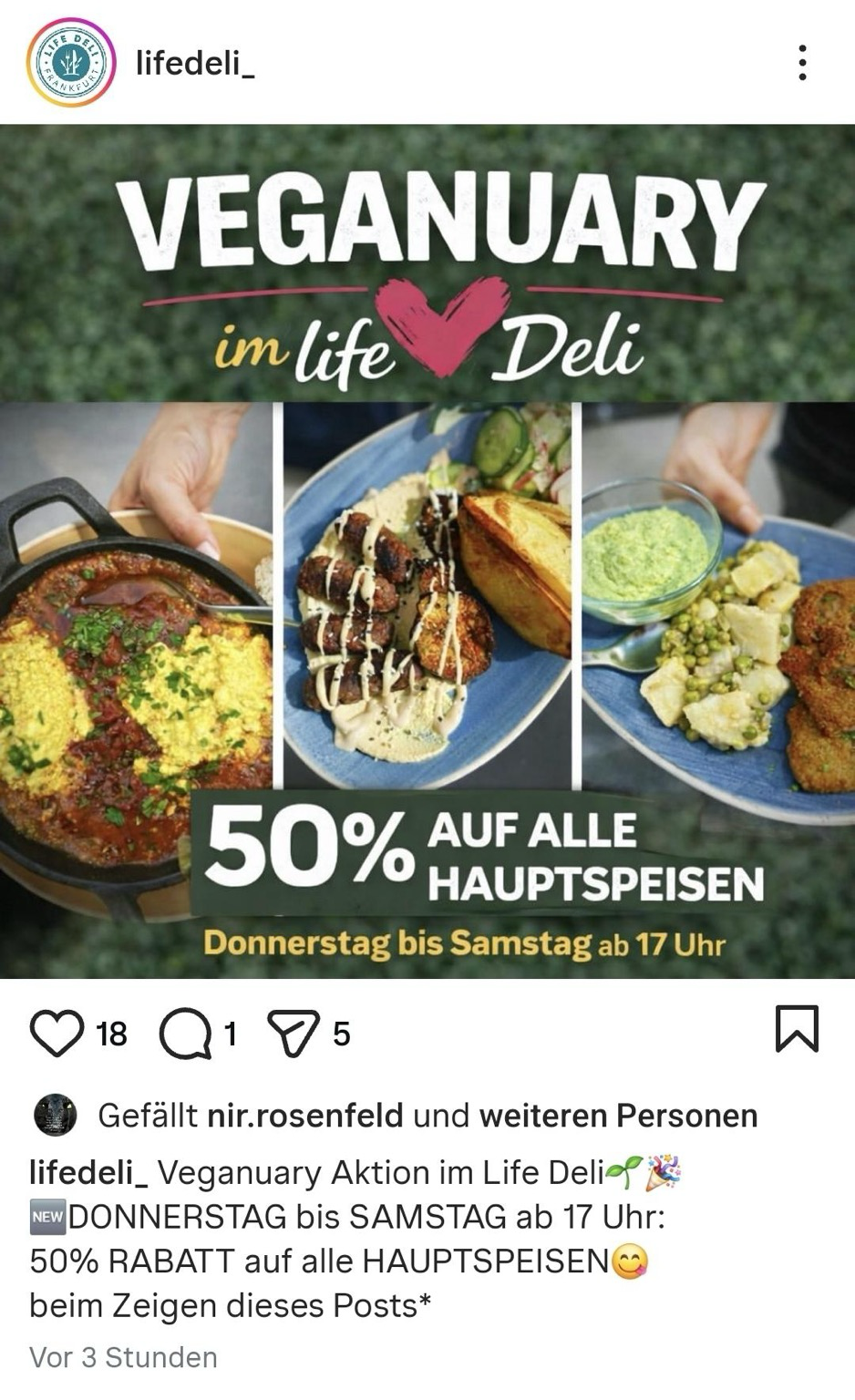 In January, #LifeDeli in #Frankfurt has 50% off on all main courses. The offer is available Thursday to Saturday starting at 5pm. It’s a fully #vegan restaurant located in the #JewishMuseum. Their post on #Instagram says, you have to show the post, so I attach a screenshot of it to this post here. Hope it’ll be ok 🤷♀️