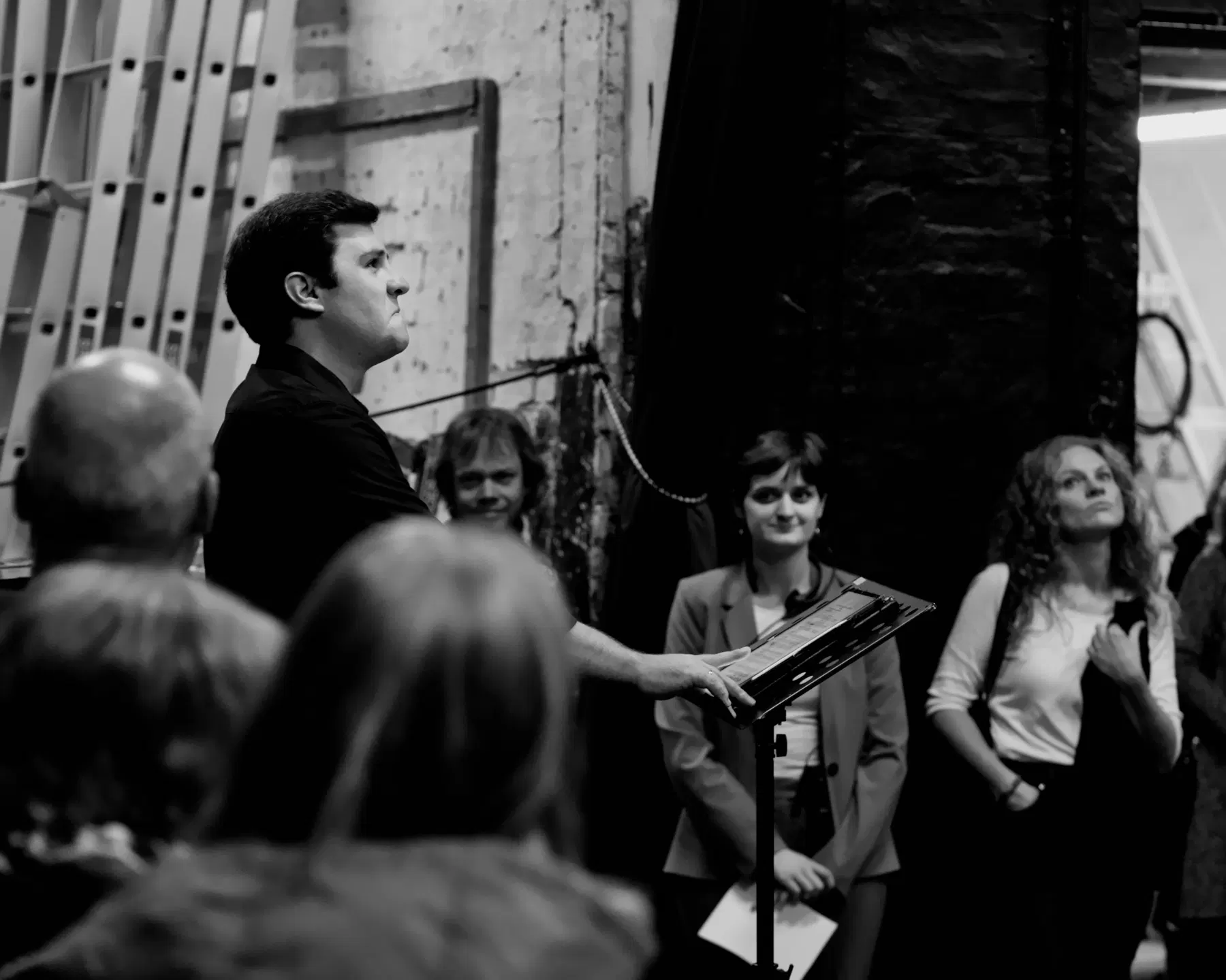 Das Schwarz-Weiß-Foto zeigt eine intime, schwach beleuchtete Szene, in der drei Personen an einem Tisch sitzen, wobei der Fokus auf der intensiven Interaktion mit elektronischen Geräten liegt. Das Bild fängt einen Moment konzentrierter Arbeit oder Interaktion ein, möglicherweise während eines Events, einer Probe oder einer Arbeitssitzung, wie ähnliche Fotos nahelegen.