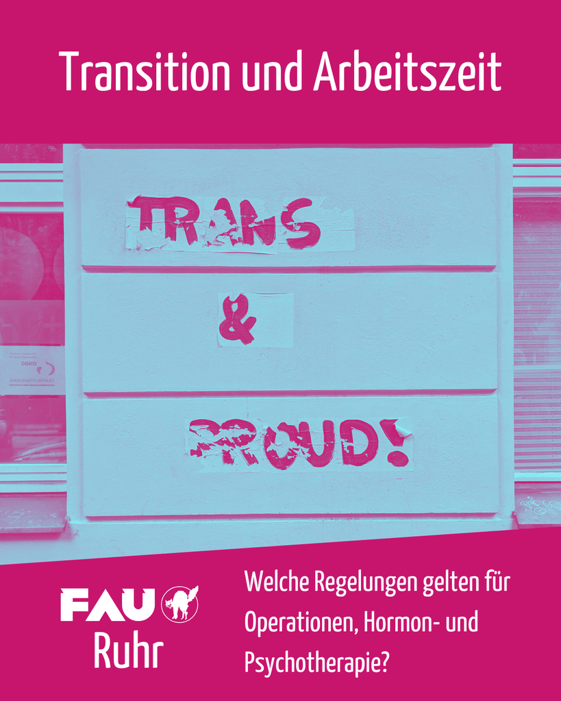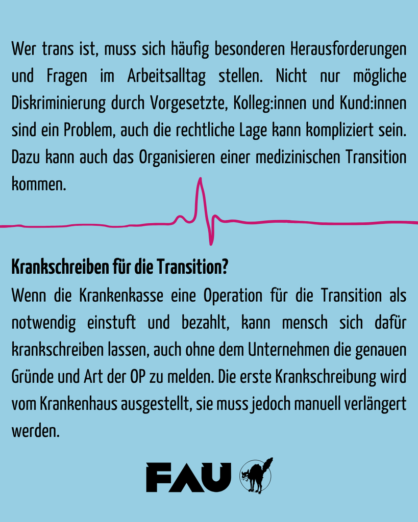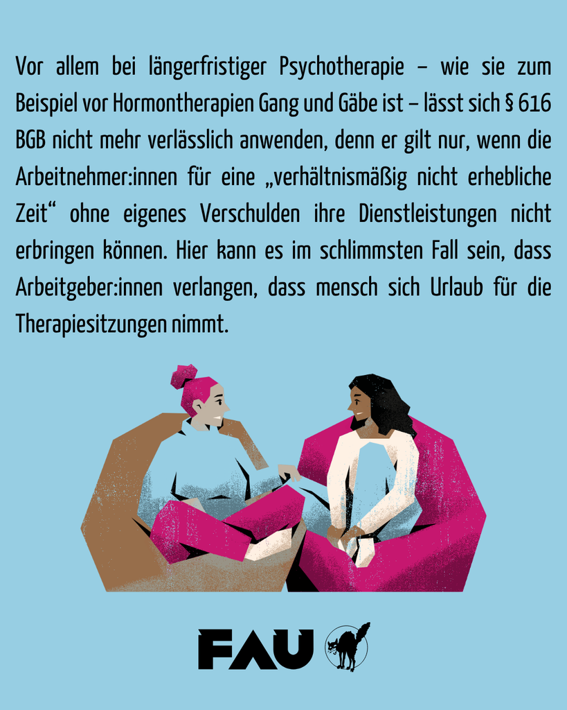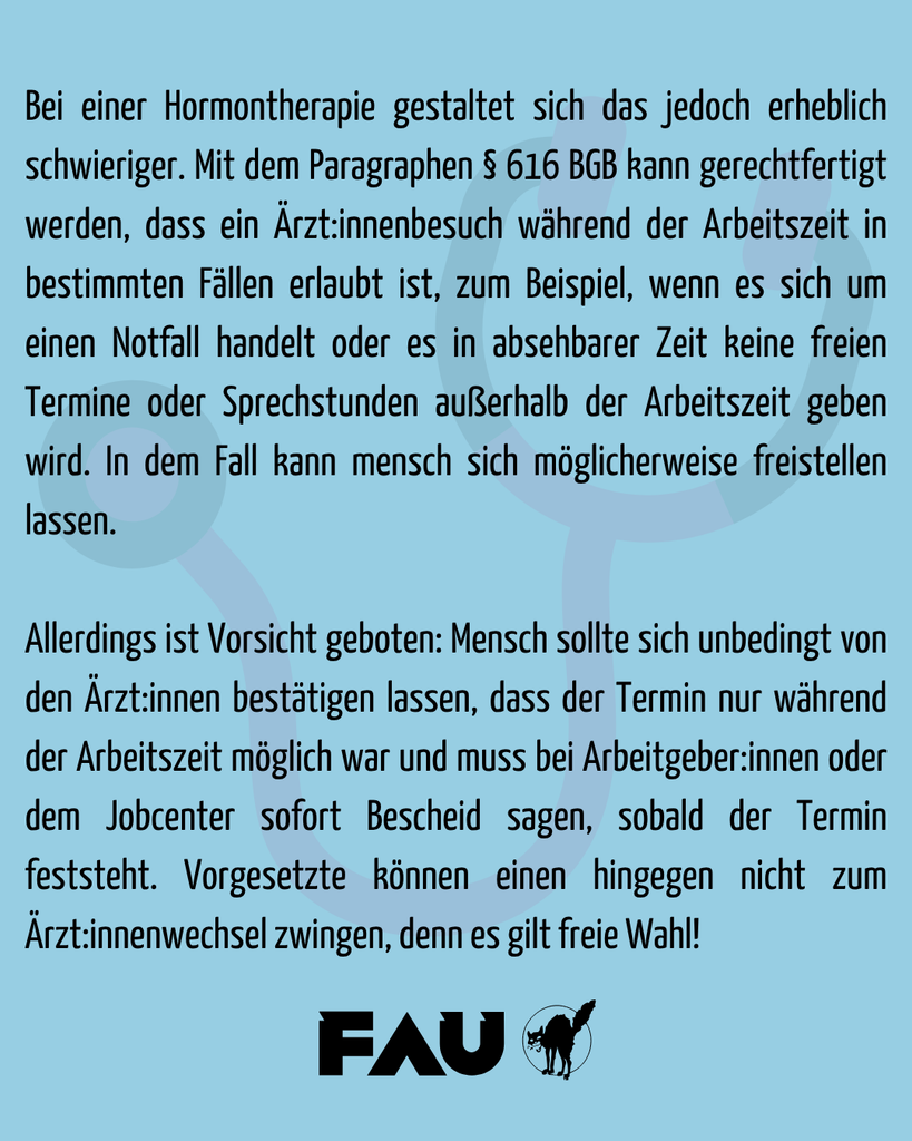 Ein Text, der mit einem Stethoskop und dem Logo der FAU dekoriert ist. Er lautet: "Bei einer Hormontherapie gestaltet sich das jedoch erheblich schwieriger. Mit dem Paragraphen § 616 BGB kann gerechtfertigt werden, dass ein Ärzt:innenbesuch während der Arbeitszeit in bestimmten Fällen erlaubt ist, zum Beispiel, wenn es sich um einen Notfall handelt oder es in absehbarer Zeit keine freien Termine oder Sprechstunden außerhalb der Arbeitszeit geben wird. In dem Fall kann mensch sich möglicherweise freistellen lassen.
