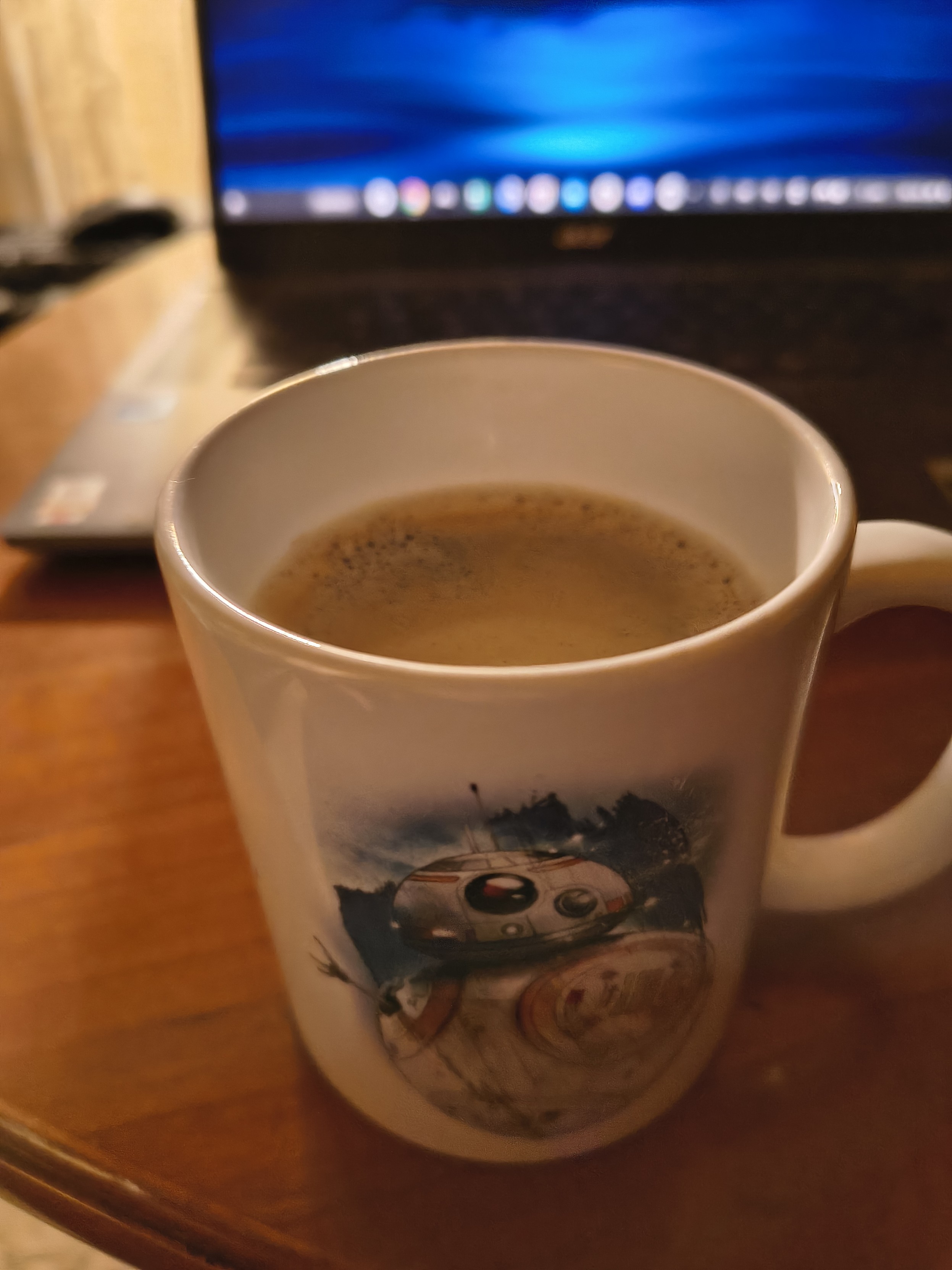 Draußen sind’s -8 Grad. Mein innerer BB-8 würde sich bei dem Frost am liebsten direkt wieder unter die Decke rollen. 🤖 Aber hilft ja nix, der Kaffee muss es jetzt regeln.