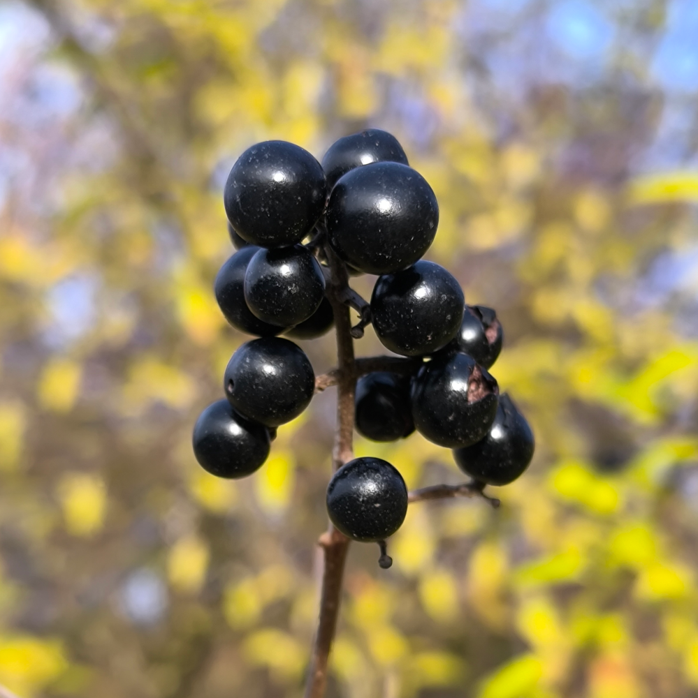 Das Foto zeigt heute die Beeren eines millionenfach wachsenden Strauchs in unseren Gärten. In der Regel wird er jedoch so stark als Heckenpflanze beschnitten, dass man weder seine wunderschönen cremefarbenen Blüten im Frühjahr, noch seine Beeren im Herbst. Die Rede ist, ihr werdet es wissen, vom Liguster (Ligustrum vulgare). Lässt man ihn gewähren, entwickelt sich ein bis zu 5 m hoher Strauch. Seine Beeren halten bis in den Spätwinter hinein und werden oft als letzte von den Vögeln angenommen.
