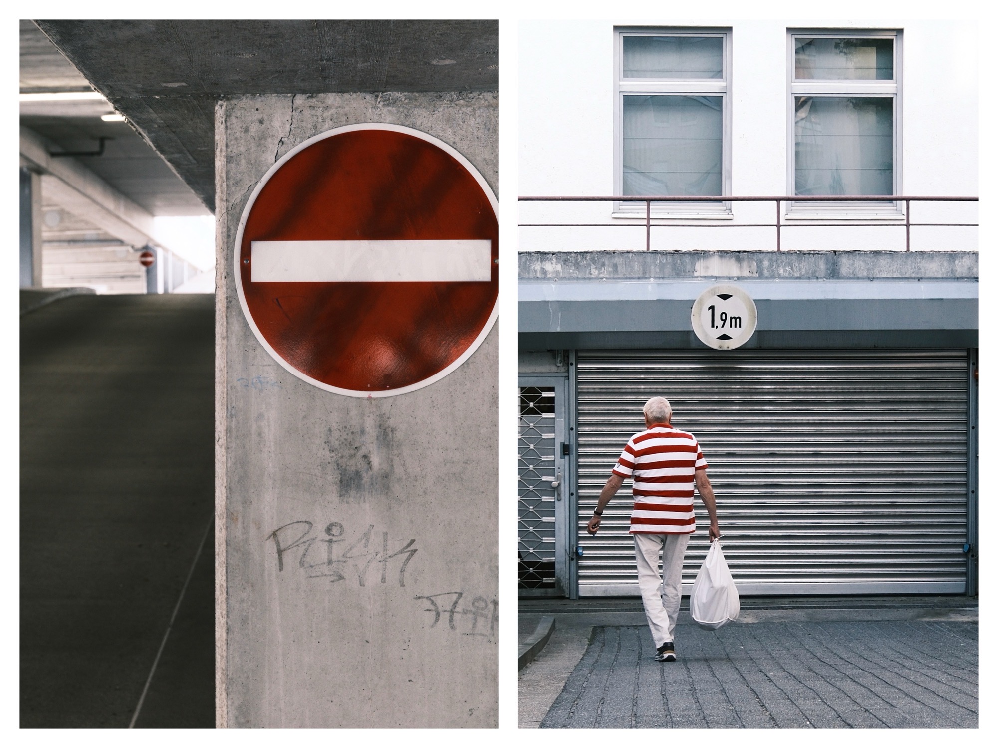 When you build up an archive of your own photos and look at them often, you notice not only recurring themes, but sometimes also individual photos with random similarities and connections. Here's an example: two garages, red and white twice, stripes twice, and round signs twice.