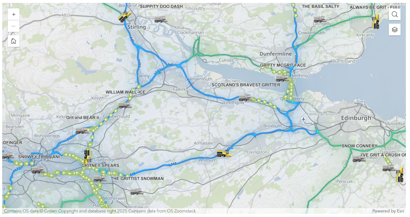 Each lorry has an excellent (and sometimes painful) gritty name and it is fun to check them out using the interactive map on Traffic Scotland's website: https://www.traffic.gov.scot/gritter-tracker