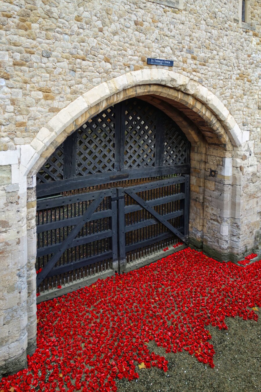 The #TraitorsGate at the #TowerOfLondon, adorned with red #poppies during the 2014 #artInstallation 𝘉𝘭𝘰𝘰𝘥 𝘚𝘸𝘦𝘱𝘵 𝘓𝘢𝘯𝘥𝘴 𝘢𝘯𝘥 𝘚𝘦𝘢𝘴 𝘰𝘧 𝘙𝘦𝘥, which commemorated the centenary of the outbreak of World War I. Each of the 888,246 ceramic red #poppies represented one British or Colonial serviceman killed in the Great War.