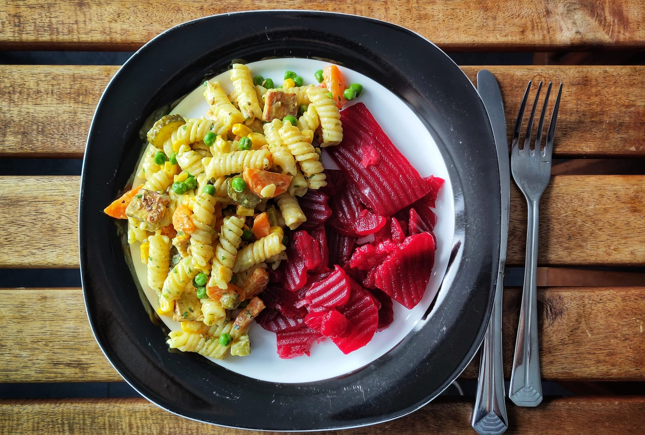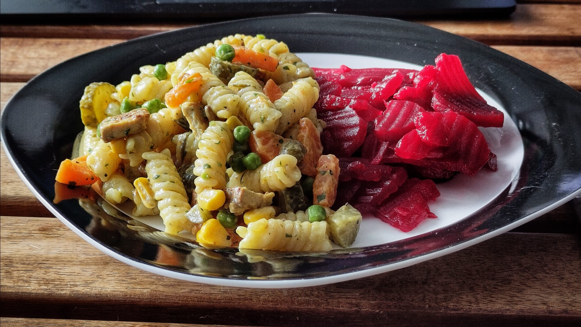 Nudelsalat mit roter Bete ausm Glas. That's it. That's the Schmackofatzi.