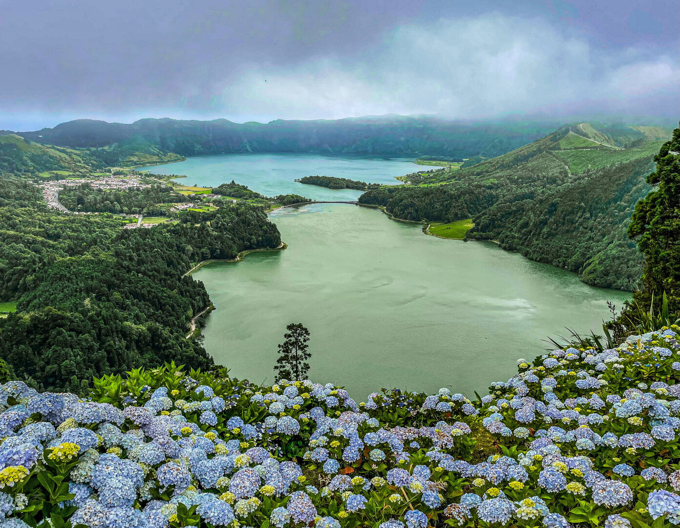 Der Mittelgrund: Die Landschaft wird dominiert von einer breiten Schicht aus dichtem, grauem Nebel, der die Fernsicht komplett verhüllt und eine geheimnisvolle, fast unwirkliche Atmosphäre schafft.