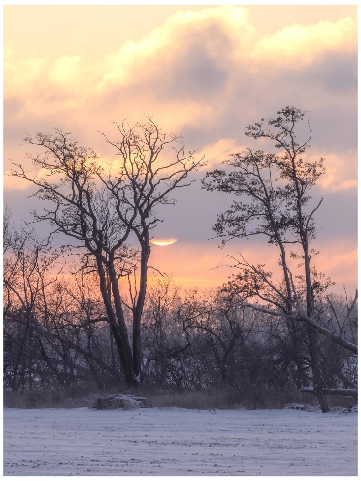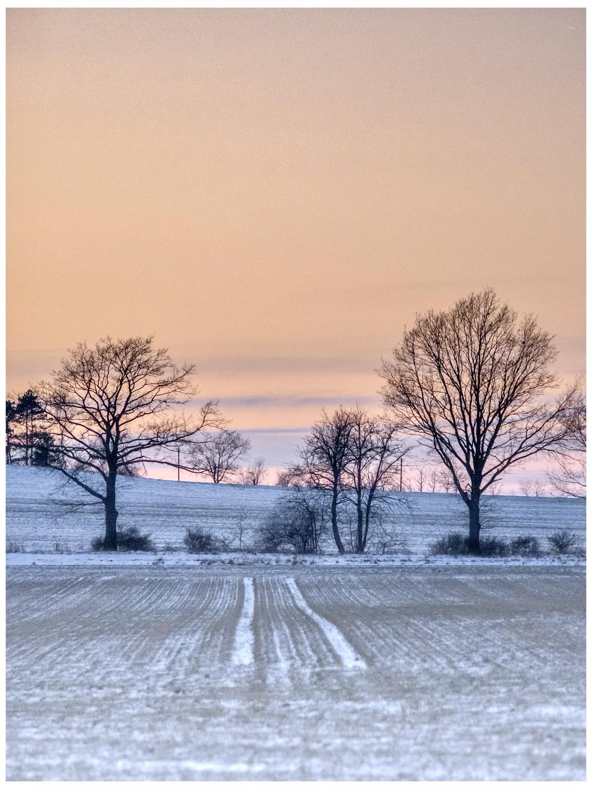 Kurz vor Einbruch der Dunkelheit mit dem Hund über die eiskalten Felder gezogen.