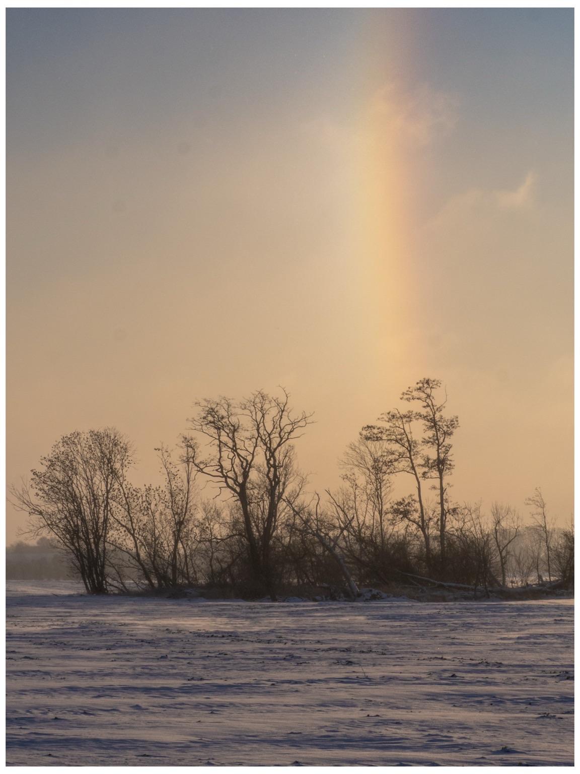 Als ich heute Morgen mit dem Hund auf Gassirunde war, ging auf der Hinrunde die Sonne genau hinter dieser Baumgruppe auf. Beim Rückweg stand da plötzlich eine Regenbogensäule- keine Ahnung wo die herkam. Auf jeden Fall schön für mich und meine Kamera.