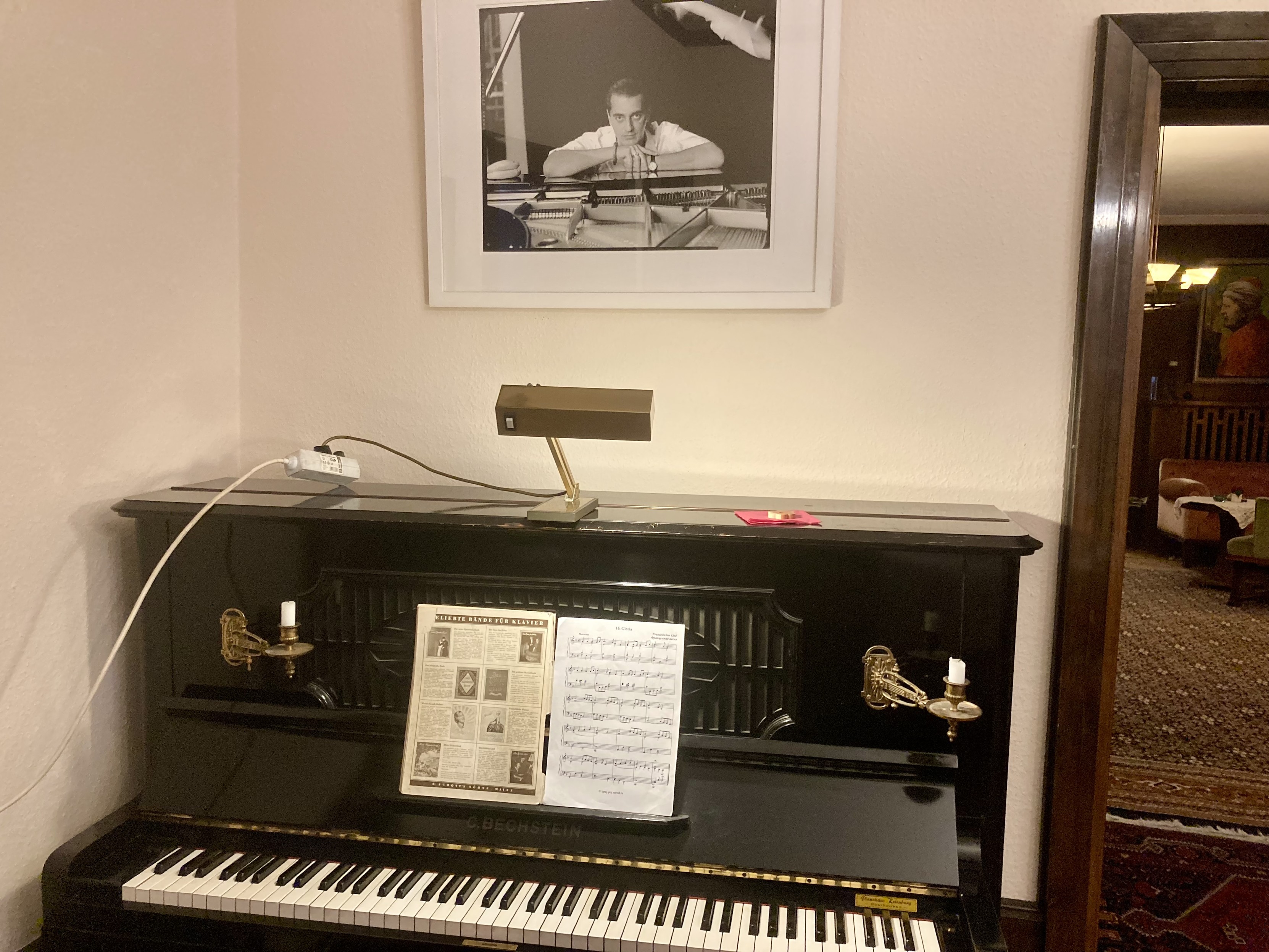 Altes Klavier in der Villa Kampschulte in Essen-Bredeney. Das Foto-Porträt gehört zur derzeitigen Ausstellung und zeigt Hagen Raether.