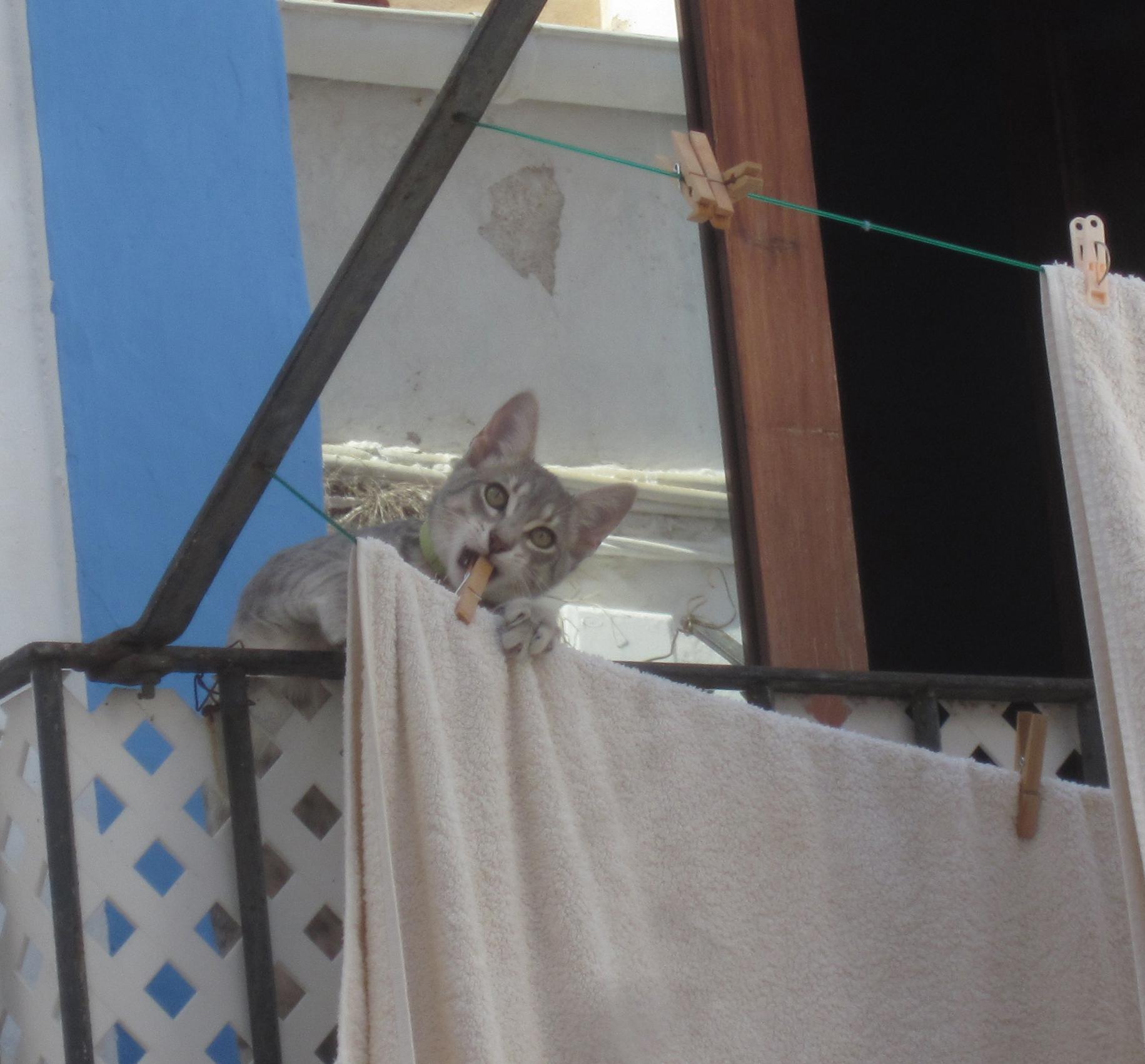 Die süße kleine Katze, die ich letzte Woche gepostet habe, hat mich entdeckt und schaut mich (fragend?) an. Dabei nagt sie weiter an der Wäscheklammer, die das Handtuch an der Leine vor dem Balkon fixiert.