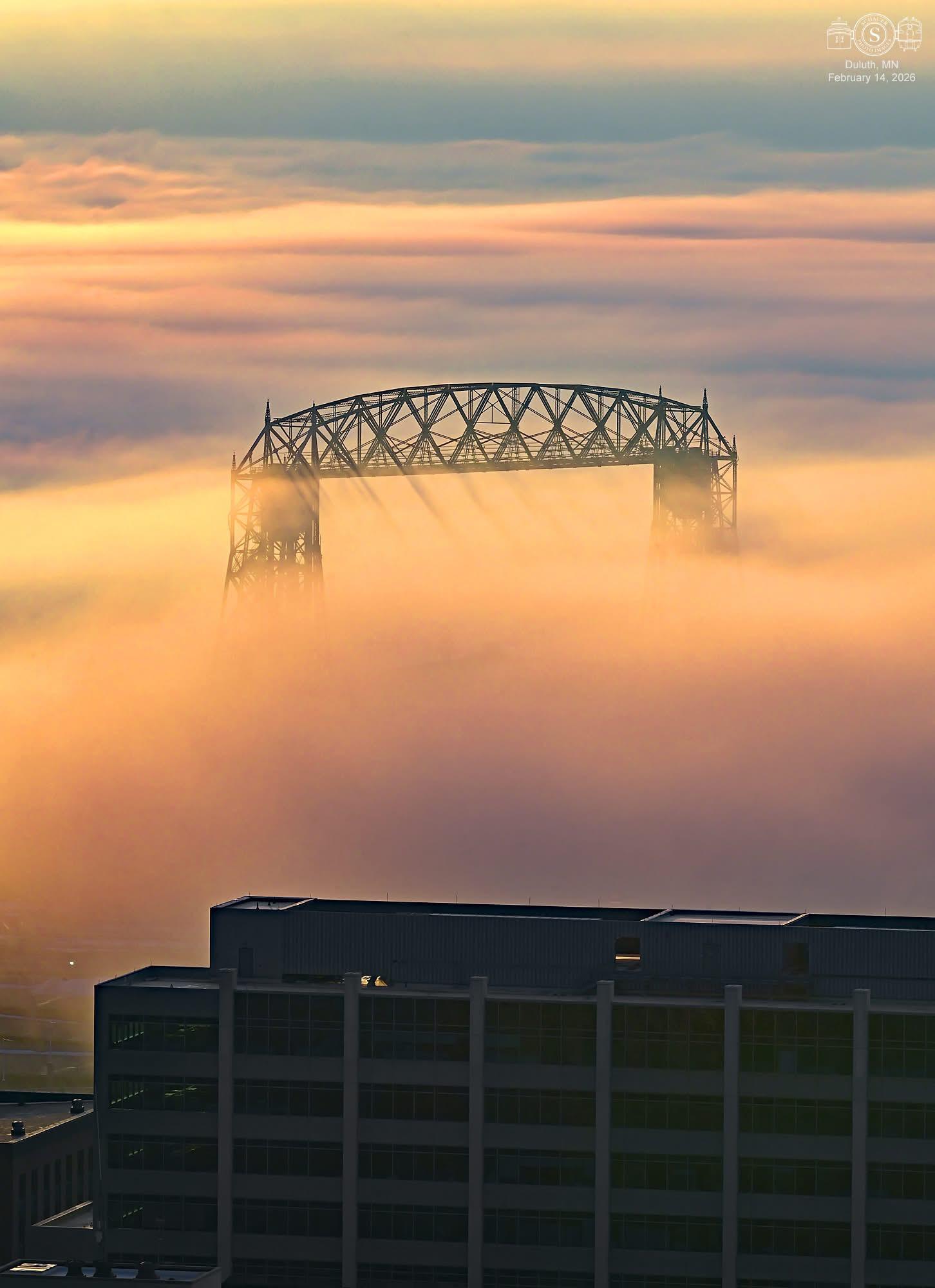 Hintergrund: Ein leuchtend orange-gelber Sonnenaufgang taucht den Himmel in warmes Licht. Über der Wasserfläche der Elbe steigt feiner Bodennebel oder "Flussrauch" auf, der durch die Sonne golden illuminiert wird.