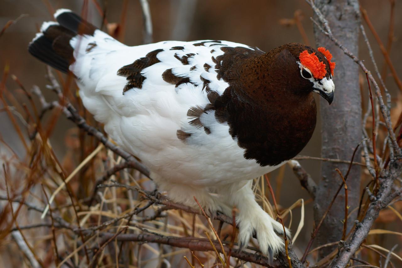 A willow ptarmigan, Alaska’s state bird, in mixed spring plumage near Polychrome Pass in Denali National Park. By early May, they’re in the middle of their transition from winter white to summer brown, which gives them this patchwork look.
