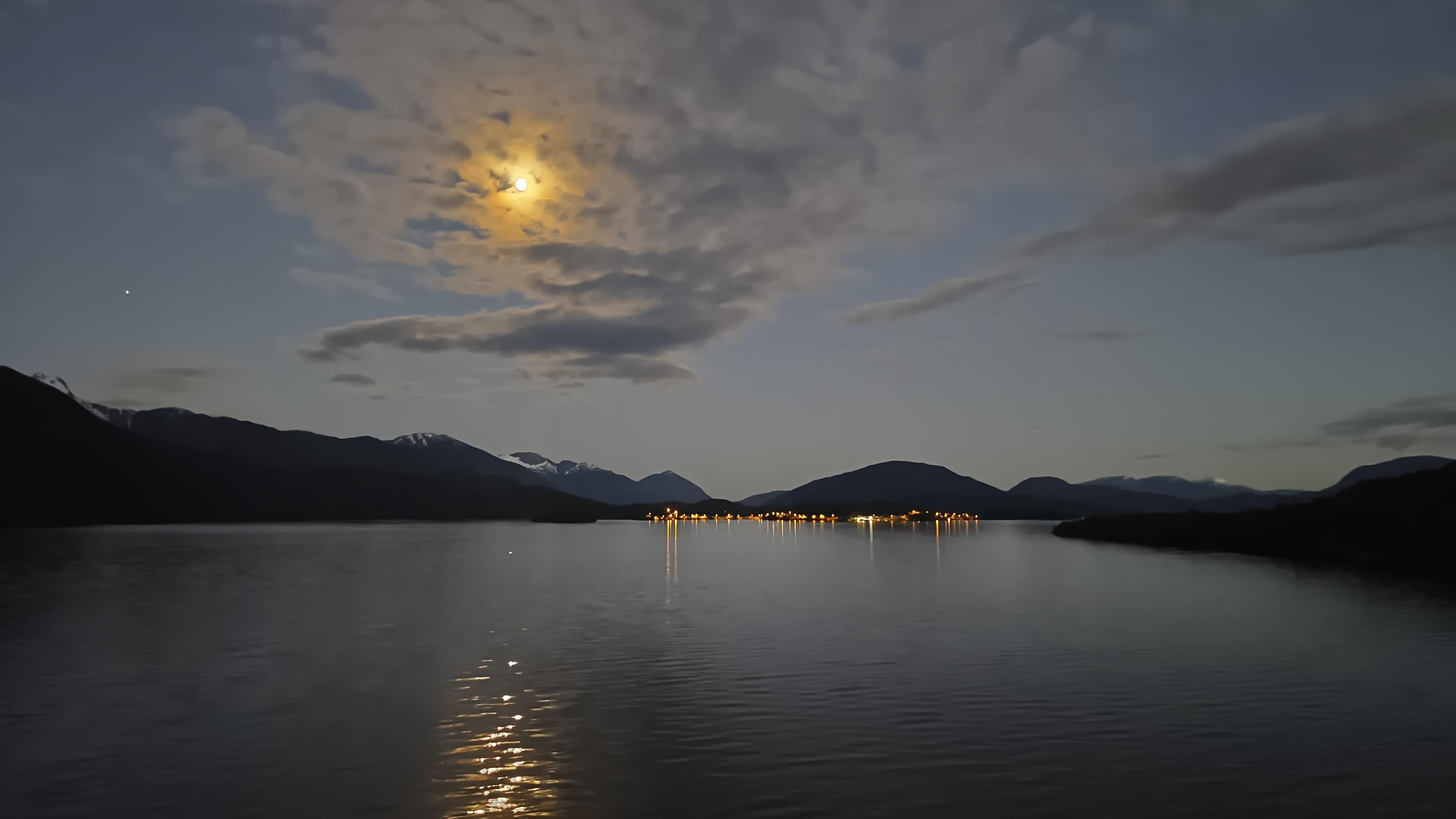 Nachtaufnahme bei fast Vollmond. Blick von Bord des Schiffes auf den Ort