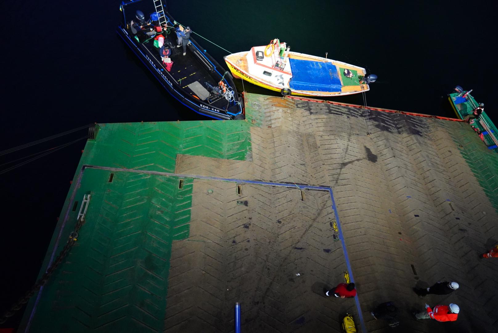 Blick auf die Laderampe der geankerten Fähre, zwei kleine Boote haben festgemacht und nehmen Passagiere und etwas Fracht auf.
