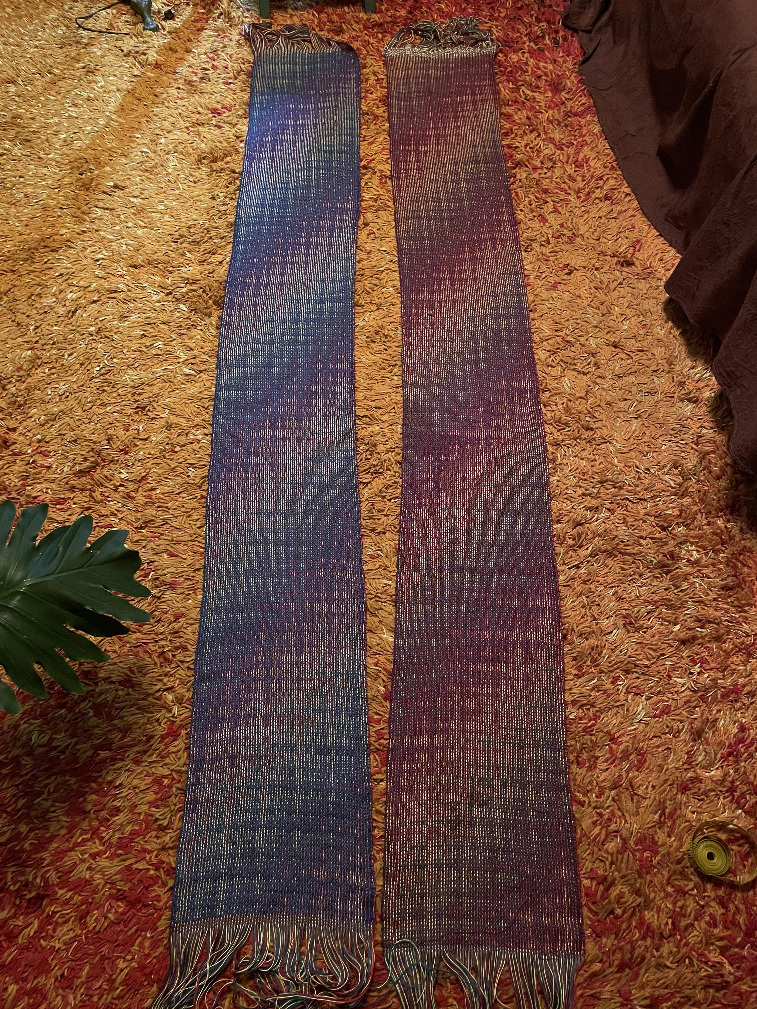 I just took these off the loom. (The color isn鈥檛 accurate because of the overhead light.) I鈥檒l start working on the fringe this evening. Hopefully in a couple of days there鈥檒l be ready for wet-finishing.