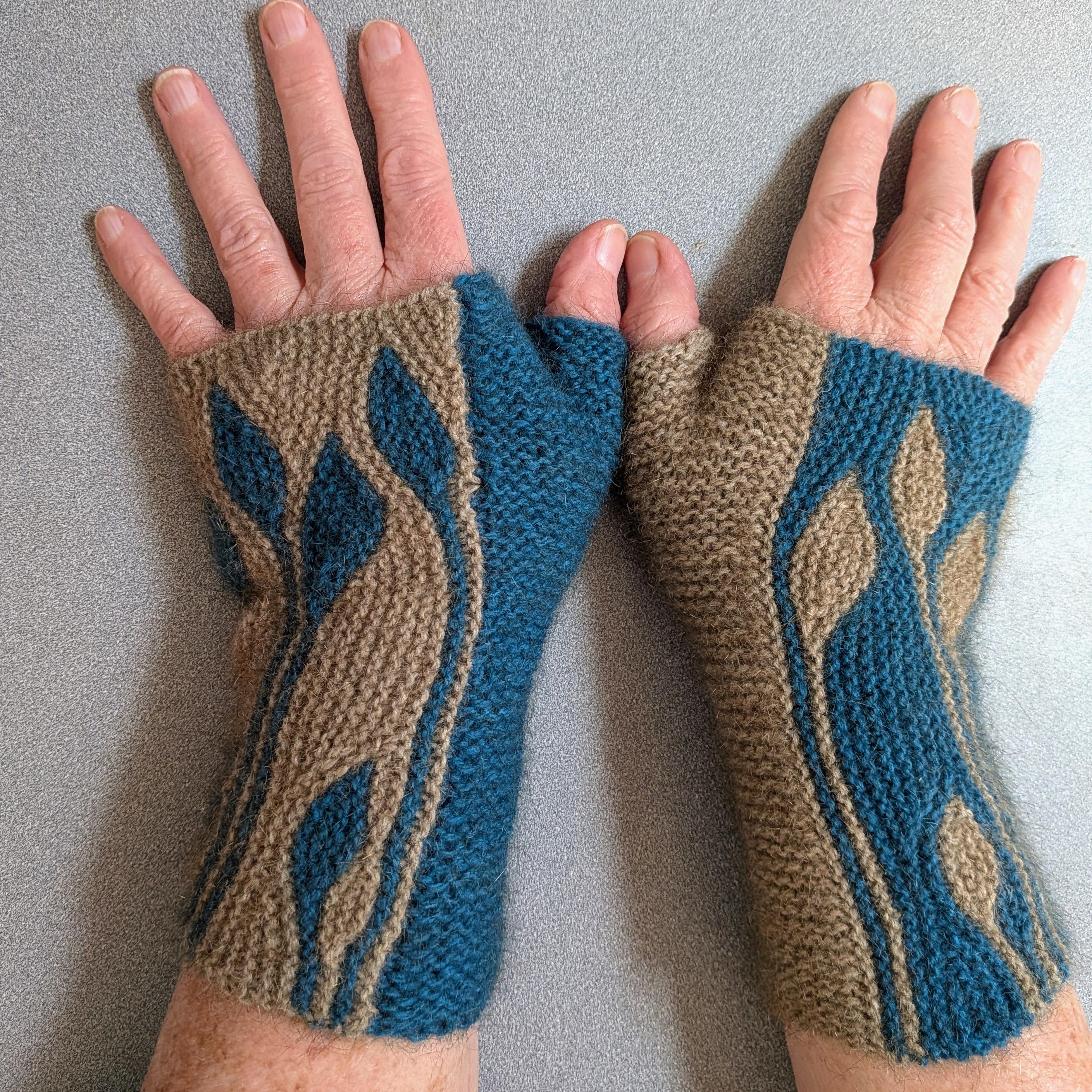 The mitt pattern is Short Wave Mitts by Sybil R. (https://knitting-and-so-on.blogspot.com/2012/10/short-wave-mitts.html)